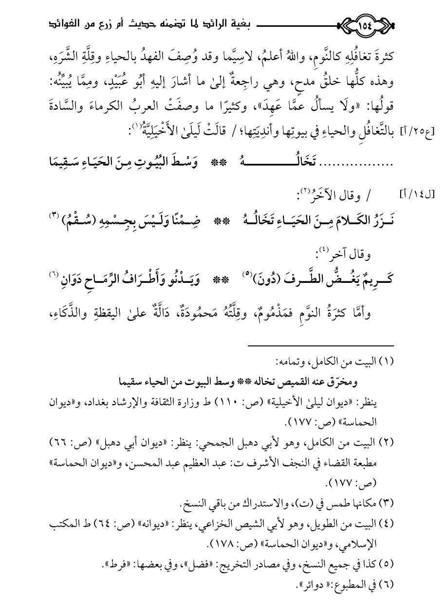 تغافُلِهِ كالنَّومِ، واللهُ أعلمُ، لاسِيَّما وقد وُصِفَ الفهدُ بالحياءِ وقِلَّةِ الشَّرَهِ، وهذه كلُّها خلقُ مدحٍ، وهي راجِعةٌ إلى ما أشارَ إليهِ أبُو عُبَيْدٍ، ومِمَّا يُبيِّنُه: قولُها: «ولَا يسألُ عمَّا عَهِدَ»، وكثيرًا ما وصفَتْ العربُ الكرماءَ والسَّادةَ بالتَّغافُلِ والحياءِ في بيوتِها وأندِيَتِها؛ / قالَتْ لَيلَى الأَخْيَلِيَّةُ (¬١):
