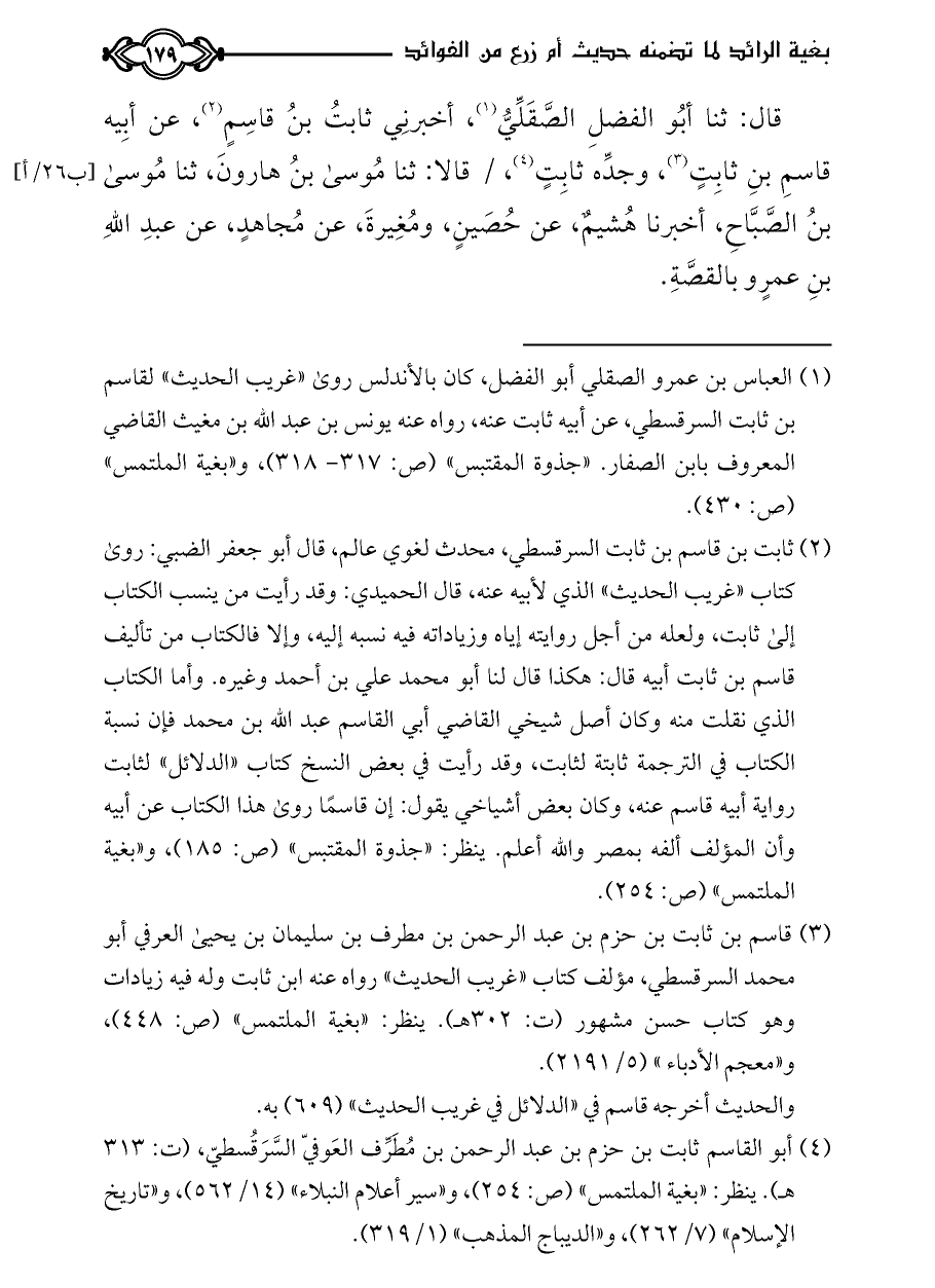 (¬٣) قاسم بن ثابت بن حزم بن عبد الرحمن بن مطرف بن سليمان بن يحيى العرفي أبو محمد السرقسطي، مؤلف كتاب «غريب الحديث» رواه عنه ابن ثابت وله فيه زيادات وهو كتاب حسن مشهور (ت: ٣٠٢ هـ). ينظر: «بغية الملتمس» (ص: ٤٤٨)، و «معجم الأدباء» (٥/ ٢١٩١).
