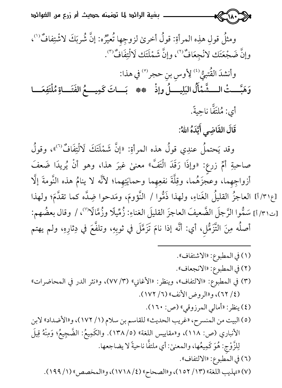ومثلُ قولِ هذِه المرأةِ: قولُ أخرى لزوجِهِا تُعيِّرُه: إنَّ شُربَكَ لاشْتِفافٌ (¬١)، وإنَّ ضَجْعَتَك لانْجِعَافٌ (¬٢)، وإنَّ شَمْلَتَك لَالْتِفَافٌ (¬٣).