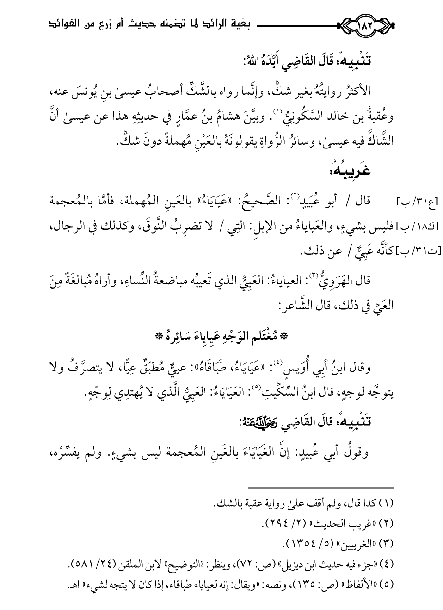 قال الهَرَوِيُّ (¬٣): العياياءُ: العَيِيُّ الذي تَعيبُه مباضعةُ النِّساءِ، وأراهُ مُبالغَةً مِنَ العَيِّ في ذلك، قال الشَّاعر: