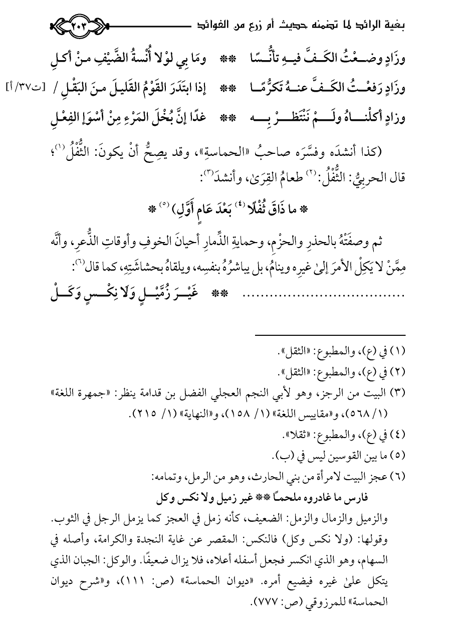(كذا أنشدَه وفسَّرَه صاحبُ «الحماسةِ»، وقد يصِحُّ أنْ يكونَ: الثُّفْلُ (¬١)؛ قال الحربِيُّ: الثُّفْلُ: (¬٢) طعامُ القِرَى، وأنشدَ (¬٣):