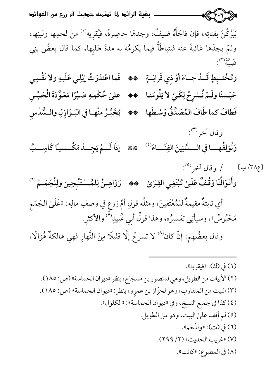 يَبْرُكْنَ بفنائِه، فإنْ فاجَأَهُ ضيفٌ، وجدهَا حاضِرةً، فيُقرِيه (¬١) منْ لحمِها ولبنِها، ولمْ يجدْها غائبةً عنه فيتباطَأْ فيما يكرمُه به مدةَ طلبِها، كما قال بعضُ بنِي ضَبَّةَ (¬٢):