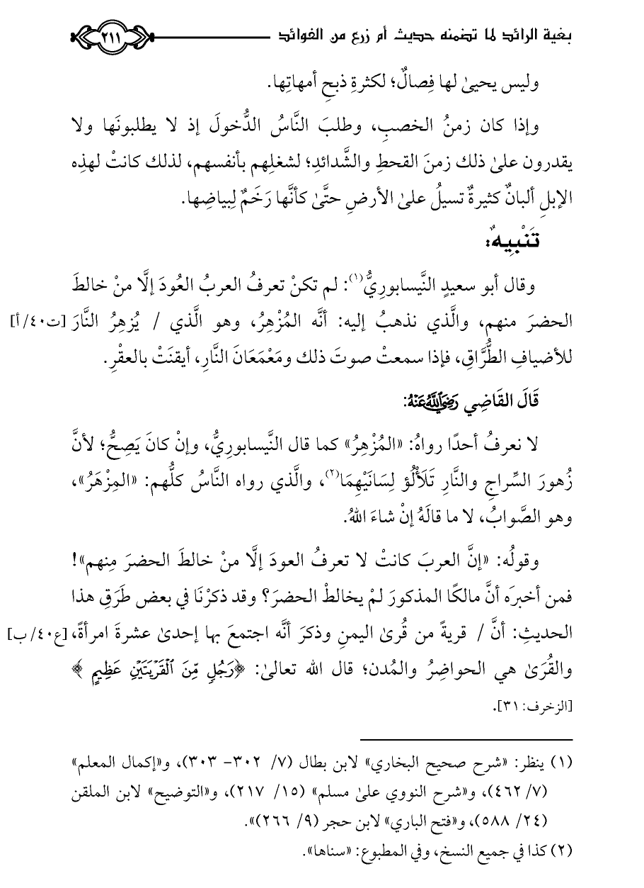 وقولُه: «إنَّ العربَ كانتْ لا تعرفُ العودَ إلَّا منْ خالطَ الحضرَ مِنهم»! فمن أخبرَه أنَّ مالكًا المذكورَ لمْ يخالطْ الحضرَ؟ وقد ذكرْنَا في بعض طَرَقِ هذا الحديثِ: أنَّ / قريةً من قُرى اليمنِ وذكرَ أنَّه اجتمعَ بها إحدى عشرةَ امرأةً، والقُرَى هي الحواضِرُ والمُدن؛ قال الله تعالى: {رَجُلٍ مِنَ الْقَرْيَتَيْنِ عَظِيمٍ} [الزخرف: ٣١].