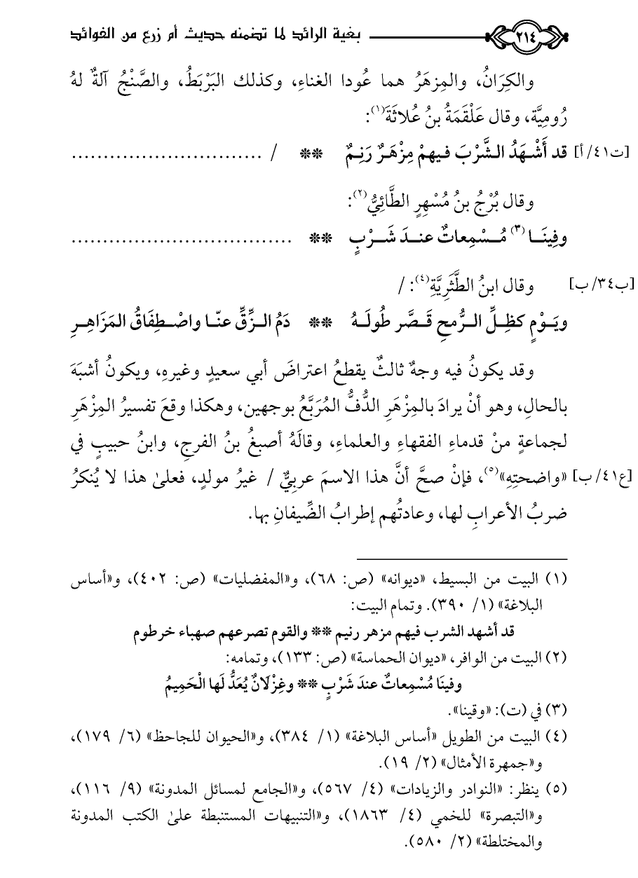 وقد يكونُ فيه وجهٌ ثالثٌ يقطعُ اعتراضَ أبي سعيدٍ وغيرهِ، ويكونُ أشبَهَ بالحالِ، وهو أنْ يرادَ بالمِزْهَرِ الدُّفُّ المُرَبَّعُ بوجهين، وهكذا وقعَ تفسيرُ المِزْهَرِ لجماعةٍ منْ قدماءِ الفقهاءِ والعلماءِ، وقالَهُ أصبغُ بنُ الفرجِ، وابنُ حبيبٍ في «واضحتِهِ» (¬٥)، فإنْ صحَّ أنَّ هذا الاسمَ عربِيٌّ / غيرُ مولدٍ، فعلى هذا لا يُنكرُ ضربُ الأعرابِ لها، وعادتُهم إطرابُ الضِّيفانِ بها.