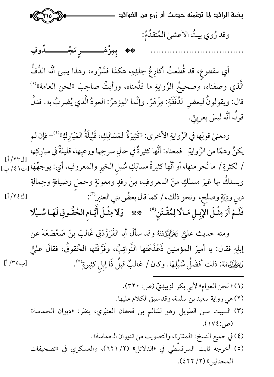 ومعنى قولِها في الرِّوايةِ الأخرى: «كَثِيرَةُ المَسَالِكِ، قَلِيلَةُ المَبَارِكِ» (¬٢) - فإن لم يكنُ وهمًا من الرِّوايةِ- فمعناه: أنَّها كثيرةٌ في حالِ سرحِها ورعيِها، قليلةٌ في مبارِكِها / لكثرةِ / ما نُحر منها، أو أنَّها كثيرةُ مسالِكِ سُبلِ الخيرِ والمعروفِ، أي: يوجهُهَا ويسلكُ بها غيرَ مسلكٍ منَ المعروفِ، مِنْ رفدٍ ومعونةٍ وحملٍ وضيافةٍ وحِمالةِ دينٍ ودِيَةٍ وصلحٍ، ونحو ذلك، / كما قال بعضُ بني العنبرِ (¬٣):