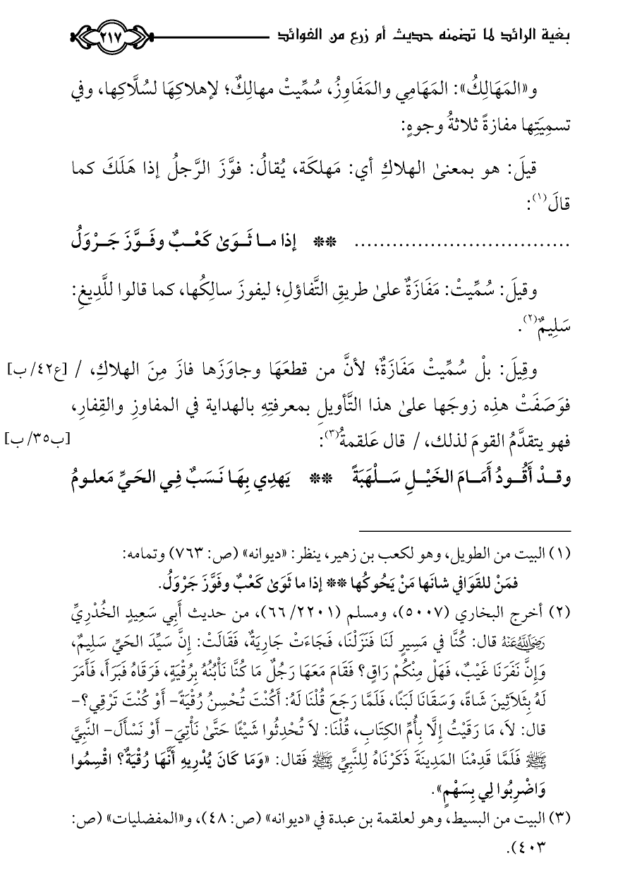 وقيلَ: سُمِّيتْ: مَفَازَةٌ على طريقِ التَّفاؤلِ؛ ليفوزَ سالِكُها، كما قالوا للَّدِيغِ: سَلِيمٌ (¬٢).