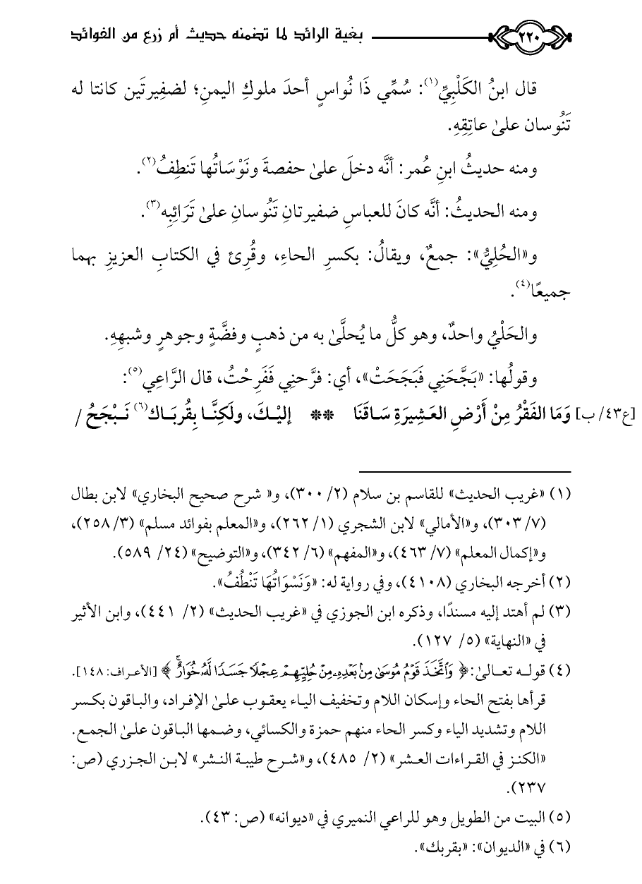 (¬١) «غريب الحديث» للقاسم بن سلام (٢/ ٣٠٠)، و «شرح صحيح البخاري» لابن بطال (٧/ ٣٠٣)، و «الأمالي» لابن الشجري (١/ ٢٦٢)، و «المعلم بفوائد مسلم» (٣/ ٢٥٨)، و «إكمال المعلم» (٧/ ٤٦٣)، و «المفهم» (٦/ ٣٤٢)، و «التوضيح» (٢٤/ ٥٨٩).