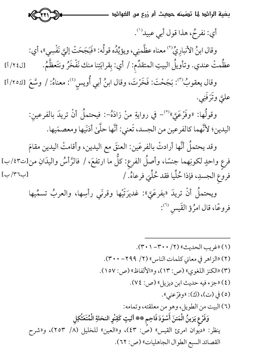 ويحتملُ أنْ تريدَ «بفرعَيَّ»: غديرَتَيْها وقرنَي رأسِها، والعربُ تسمِّيها فروعًا، قال امرُؤ القَيسِ (¬٦):