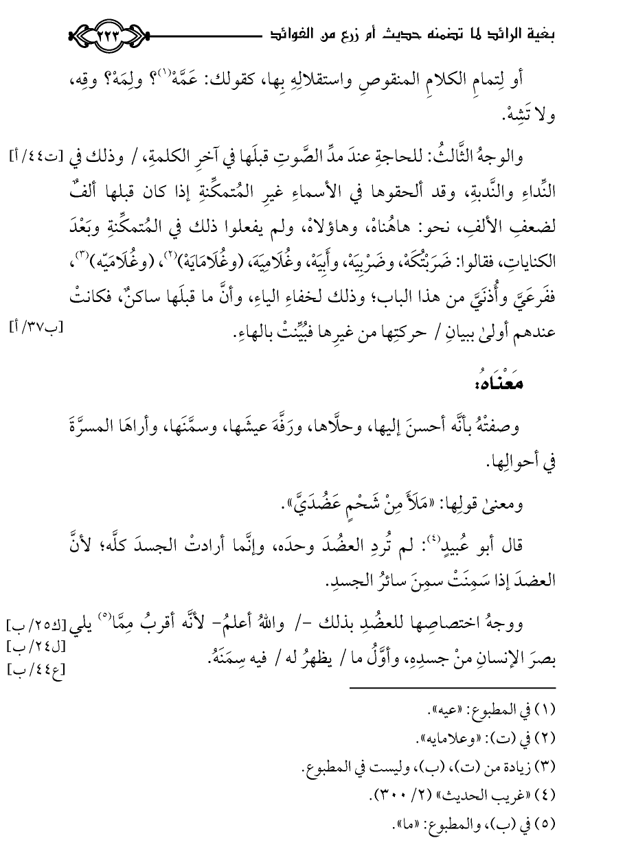 والوجهُ الثَّالثُ: للحاجةِ عندَ مدِّ الصَّوتِ قبلَها في آخرِ الكلمةِ، / وذلك في النِّداءِ والنَّدبةِ، وقد ألحقوها في الأسماءِ غيرِ المُتمكِّنةِ إذا كان قبلها ألفٌ لضعفِ الألفِ، نحو: هاهُناهْ، وهاؤلاهْ، ولم يفعلوا ذلك في المُتمكِّنةِ وبَعْدَ الكناياتِ، فقالوا: ضَرَبْتُكَهْ، وضَرْبِيَهْ، وأَبِيَهْ، وغُلَامِيَهَ، (وغُلَامَايَهْ) (¬٢)، (وغُلَامَيّه) (¬٣)، ففَرعَيَّ وأُذنَيَّ من هذا الباب؛ وذلك لخفاءِ الياءِ، وأنَّ ما قبلَها ساكنٌ، فكانتْ عندهم أولى ببيانِ / حركتِها من غيرِها فبُيِّنتْ بالهاءِ.