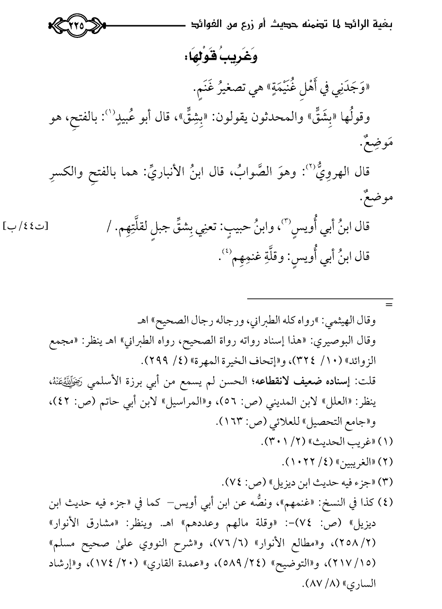 (¬٤) كذا في النسخ: «غنمهم»، ونصُّه عن ابن أبي أويس- كما في «جزء فيه حديث ابن ديزيل» (ص: ٧٤) -: «وقلة مالهم وعددهم» اهـ. وينظر: «مشارق الأنوار» (٢/ ٢٥٨)، و «مطالع الأنوار» (٦/ ٧٦)، و «شرح النووي على صحيح مسلم» (١٥/ ٢١٧)، و «التوضيح» (٢٤/ ٥٨٩)، و «عمدة القاري» (٢٠/ ١٧٤)، و «إرشاد الساري» (٨/ ٨٧).