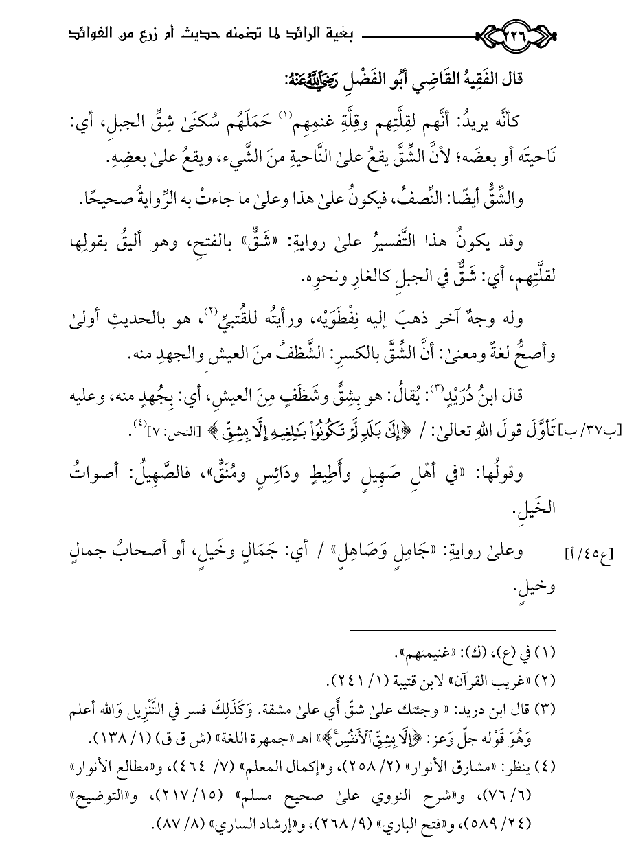 (¬٣) قال ابن دريد: «وجئتك على شقّ أَي على مشقة. وَكَذَلِكَ فسر في التَّنْزِيل وَالله أعلم وَهُوَ قَوْله جلّ وَعز: {إِلَّا بِشِقِّ الْأَنْفُسِ}» اهـ «جمهرة اللغة» (ش ق ق) (١/ ١٣٨).