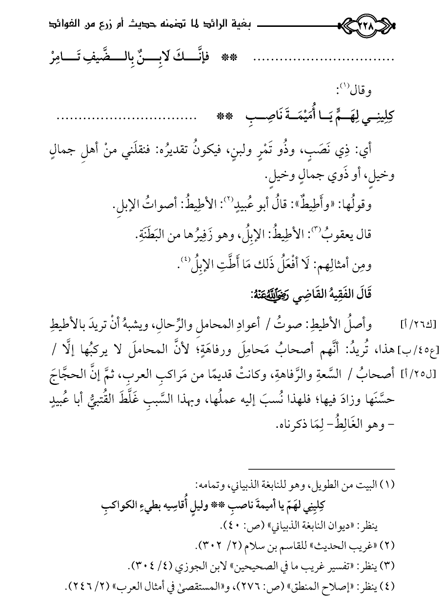 وأصلُ الأطيطِ: صوتُ / أعوادِ المحاملِ والرِّحالِ، ويشبهُ أنْ تريدَ بالأطيطِ هذا، تُريدُ: أنَّهم أصحابُ مَحامِلَ ورفاهَةٍ؛ لأنَّ المحاملَ لا يركبُها إلَّا / أصحابُ / السَّعةِ والرَّفاهةِ، وكانتْ قديمًا من مَراكبِ العربِ، ثمَّ إنَّ الحجَّاجَ حسَّنَها وزادَ فيها؛ فلهذا نُسبَ إليه عملُها، وبهذا السَّببِ غَلَّطَ القُتبيُّ أبا عُبيدٍ
