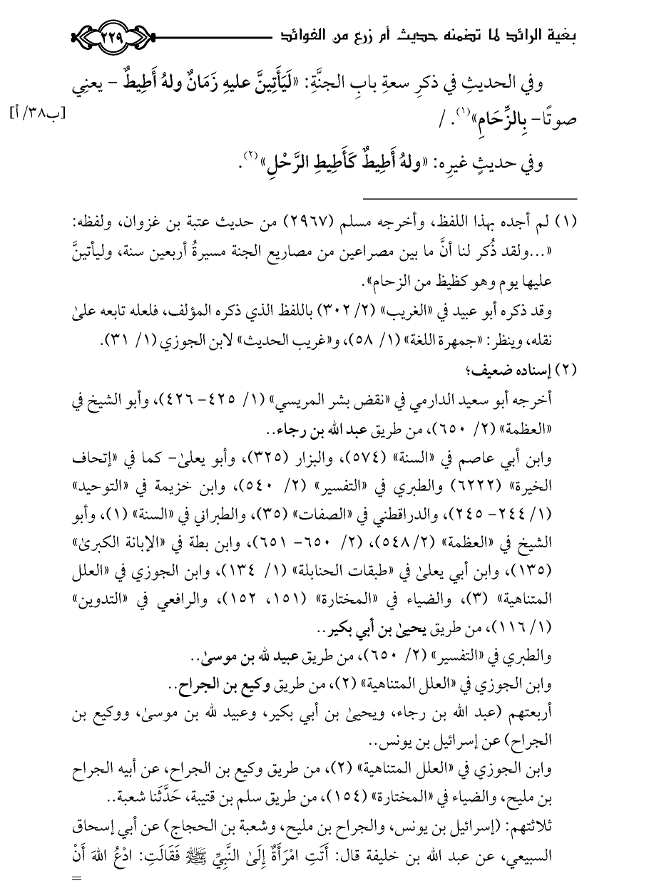 ثلاثتهم: (إسرائيل بن يونس، والجراح بن مليح، وشعبة بن الحجاج) عن أبي إسحاق السبيعي، عن عبد الله بن خليفة قال: أَتَتِ امْرَأَةٌ إِلَى النَّبِيِّ - صلى الله عليه وسلم - فَقَالَتِ: ادْعُ اللَّهَ أَنْ يُدْخِلَنِي الْجَنَّةَ، فَعَظَّمَ الرَّبَّ - عز وجل - وَقال: «إِنَّ كُرْسِيَّهُ وَسِعَ السَّمَاوَاتِ وَالْأَرْضَ، وَإِنَّهُ يَقْعُدُ عَلَيْهِ فَمَا يَفْضُلُ مِنْهُ قِيدُ أَرْبَعِ أَصَابِعَ- مَدَّ أَصَابِعَهُ الْأَرْبَعَ- وَإِنَّ لَهُ أَطِيطًا كَأَطِيطِ الرَّحْلِ الْجَدِيدِ إِذَا رُكِبَ مِنْ ثِقَلِهِ».