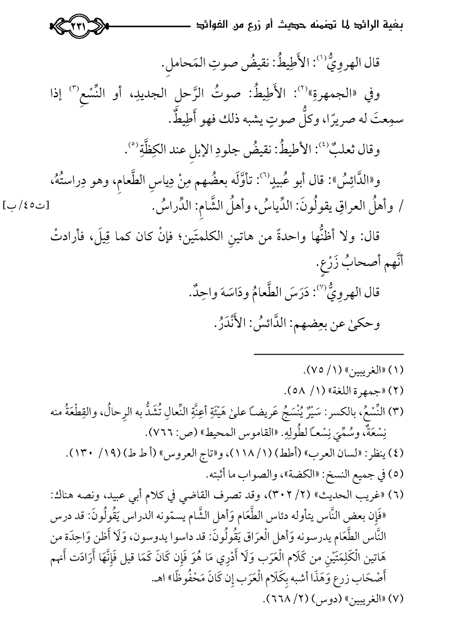 (¬٦) «غريب الحديث» (٢/ ٣٠٢)، وقد تصرف القاضي في كلام أبي عبيد، ونصه هناك: «فَإِن بعض النَّاس يتأوله دئاس الطَّعَام وَأهل الشَّام يسمّونه الدراس يَقُولُونَ: قد درس النَّاس الطَّعَام يدرسونه وَأهل الْعرَاق يَقُولُونَ: قد داسوا يدوسون، وَلَا أَظن وَاحِدَة من هَاتين الْكَلِمَتَيْنِ من كَلَام الْعَرَب وَلَا أَدْرِي مَا هُوَ فَإِن كَانَ كَمَا قيل فَإِنَّهَا أَرَادَت أَنهم أَصْحَاب زرع وَهَذَا أشبه بِكَلَام الْعَرَب إِن كَانَ مَحْفُوظًا» اهـ.