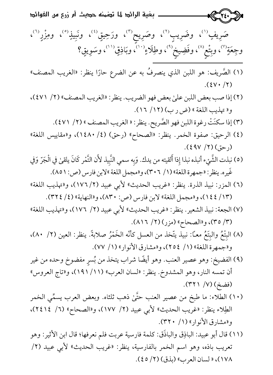 صَرِيفٍ (¬١)، وضَرِيبٍ (¬٢)، وصَرِيحٍ (¬٣)، ورَحِيقٍ (¬٤)، ونَبِيذٍ (¬٥)، ومِزْرٍ (¬٦)، وجِعَةٍ (¬٧)، وبِتْعٍ (¬٨)، وفَضِيخٍ (¬٩)، وطِلَاءٍ (¬١٠)،