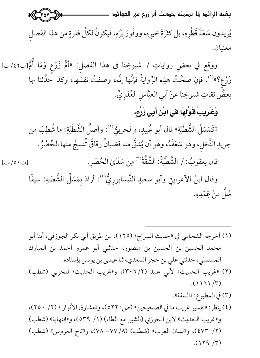 (¬٤) ينظر: «تفسير غريب ما في الصحيحين» (ص: ٥٢٢)، و «مشارق الأنوار» (٢/ ٢٥٠)، و «غريب الحديث» لابن الجوزي (الشين مع الطاء) (١/ ٥٣٩)، و «النهاية» (شطب) (٢/ ٤٧٣)، و «لسان العرب» (شطب) (٨/ ٧٧ - ٧٨)، و «تاج العروس» (شطب) (٣/ ١٢٩).