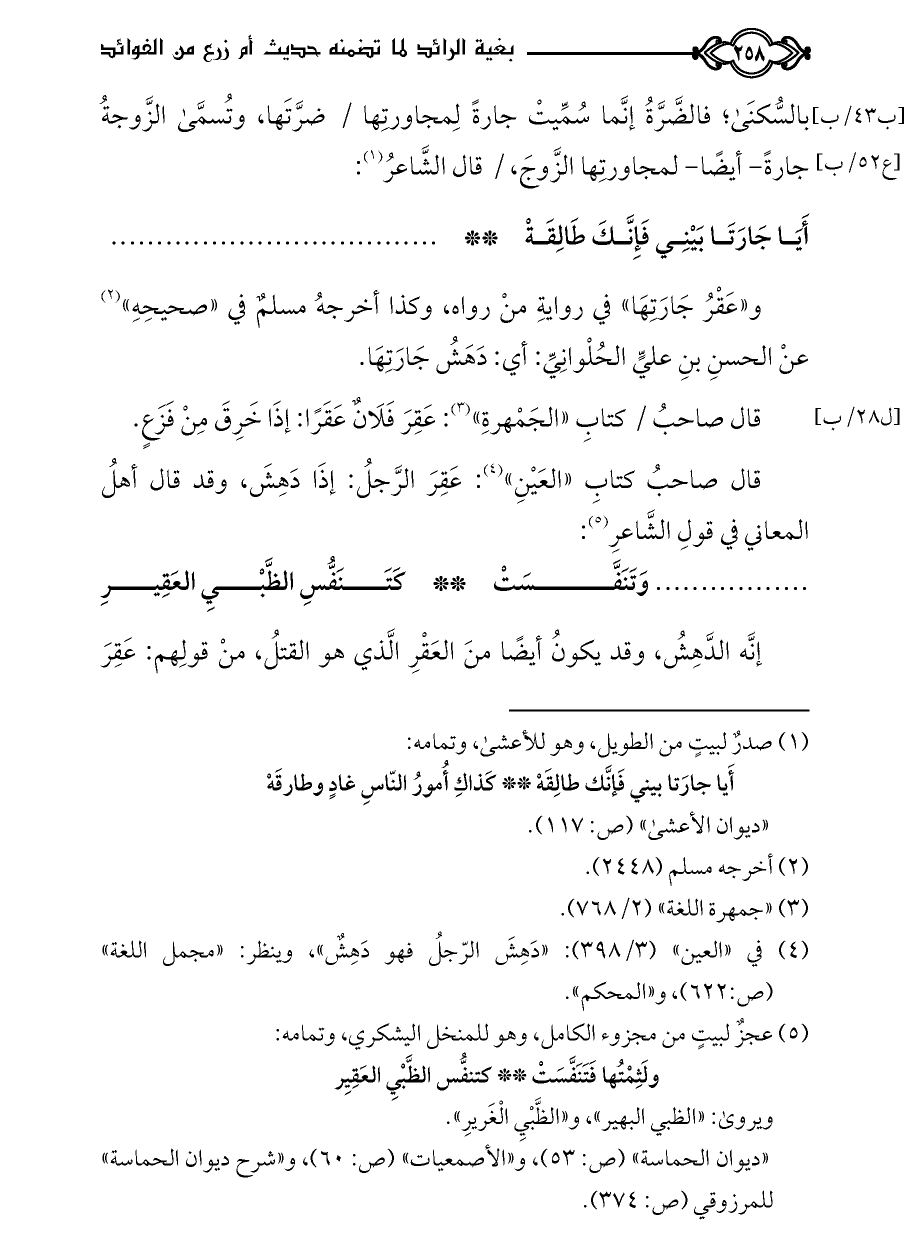 و«عَقْرُ جَارَتِهَا» في روايةِ منْ رواه، وكذا أخرجهُ مسلمٌ في «صحيحِهِ» (¬٢) عنْ الحسنِ بنِ عليٍّ الحُلْوانِيِّ: أي: دَهَشُ جَارَتِهَا.