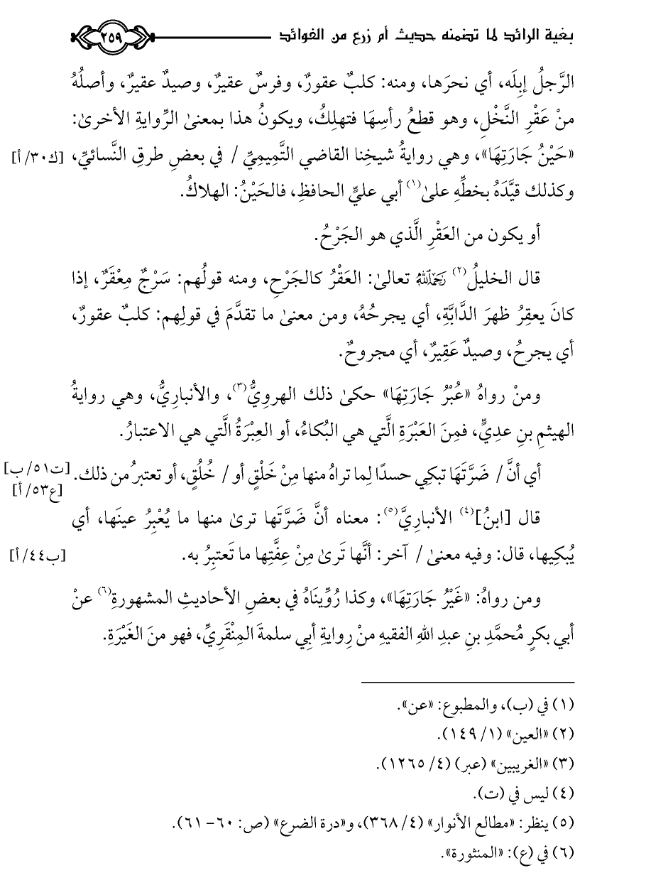 الرَّجلُ إبِلَه، أي نحرَها، ومنه: كلبٌ عقورٌ، وفرسٌ عقيرٌ، وصيدٌ عقيرٌ، وأصلُهُ منْ عَقْرِ النَّخْلِ، وهو قطعُ رأسِهَا فتهلِكُ، ويكونُ هذا بمعنى الرِّوايةِ الأخرى: «حَيْنُ جَارَتِهَا»، وهي روايةُ شيخِنا القاضي التَّمِيمِيِّ / في بعضِ طرقِ النَّسائيِّ، وكذلك قيَّدَهُ بخطِّهِ على (¬١) أبي عليٍّ الحافظِ، فالحَيْنُ: الهلاكُ.