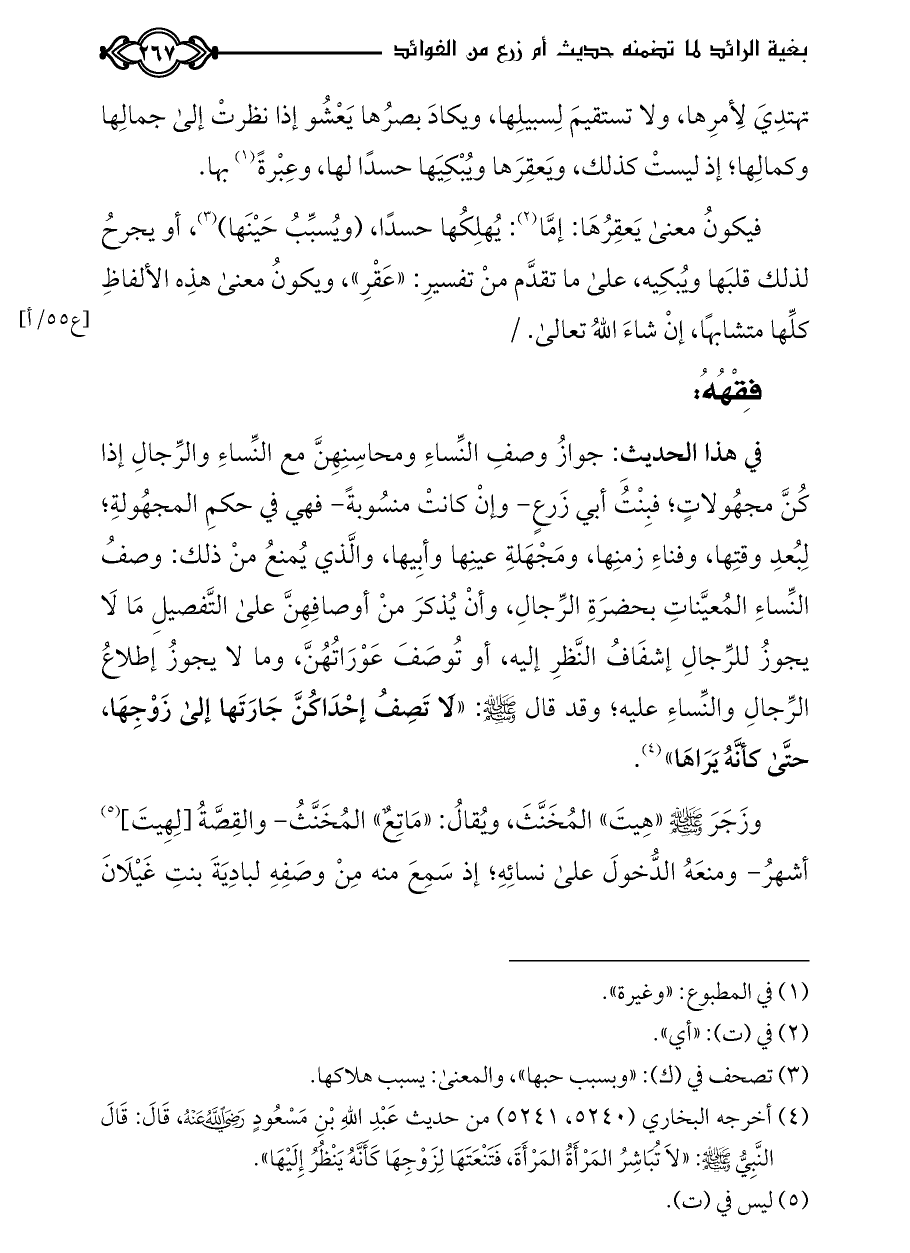 (¬٤) أخرجه البخاري (٥٢٤٠، ٥٢٤١) من حديث عَبْدِ اللَّهِ بْنِ مَسْعُودٍ - رضي الله عنه -، قَالَ: قَالَ النَّبِيُّ - صلى الله عليه وسلم -: «لا تُبَاشِرُ المَرْأَةُ المَرْأَةَ، فَتَنْعَتَهَا لِزَوْجِهَا كَأَنَّهُ يَنْظُرُ إِلَيْهَا».