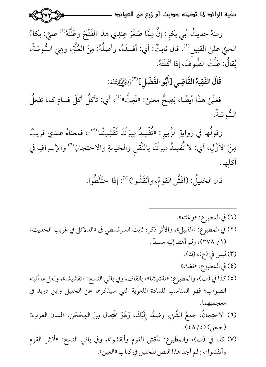 (¬٧) كذا في (ب)، والمطبوع: «أقش القوم وأنقشوا»، وفي باقي النسخ: «أفش القوم وأنفشوا»، ولم أجد هذا النص للخليل في كتاب «العين».