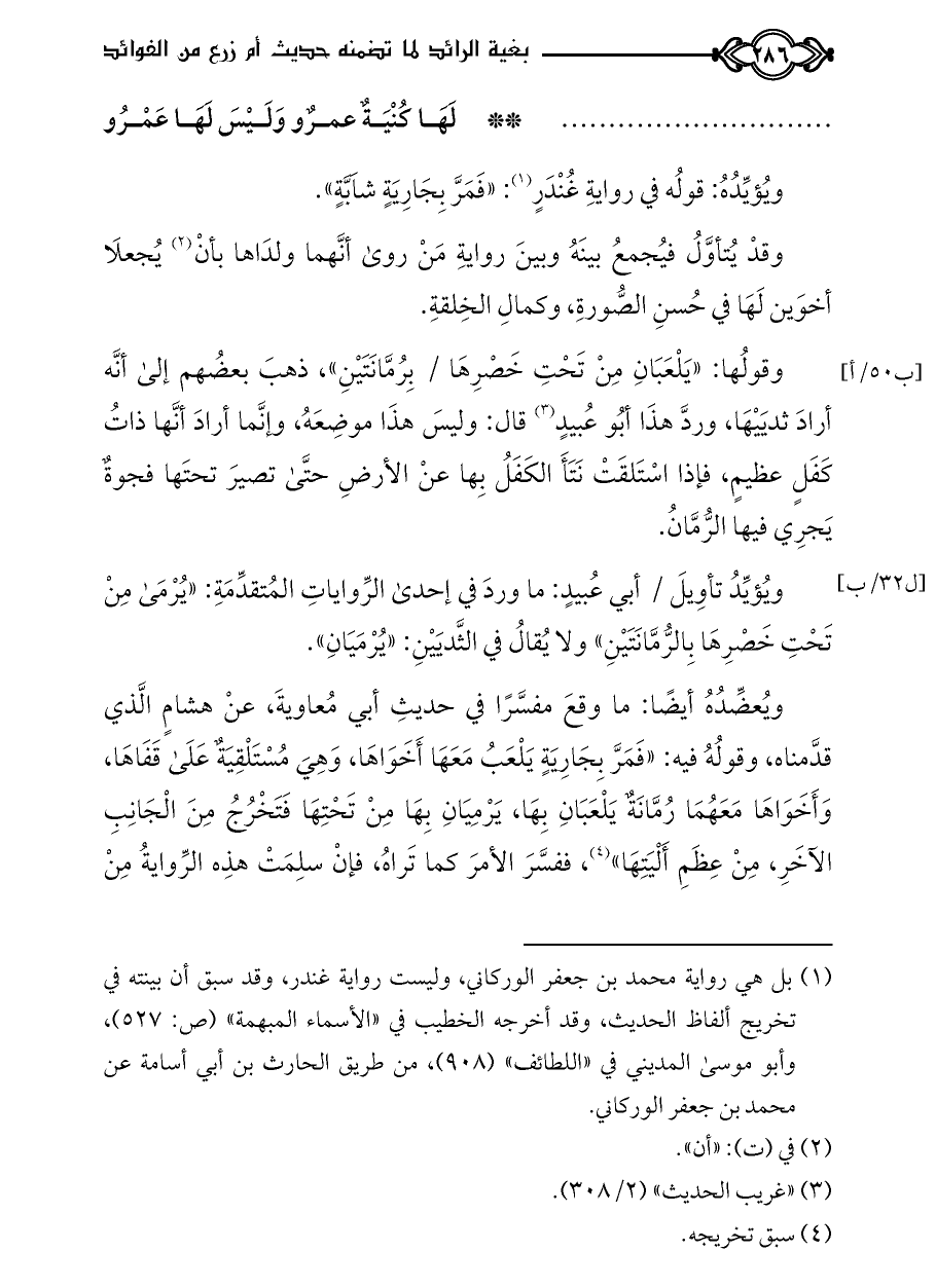 وقولُها: «يَلْعَبَانِ مِنْ تَحْتِ خَصْرِهَا / بِرُمَّانَتَيْنِ»، ذهبَ بعضُهم إلى أنَّه أرادَ ثديَيْهَا، وردَّ هذَا أبُو عُبيدٍ (¬٣) قال: وليسَ هذَا موضِعَهُ، وإنَّما أرادَ أنَّها ذاتُ كَفَلٍ عظيمٍ، فإذا اسْتَلقَتْ نَتَأَ الكَفَلُ بِها عنْ الأرضِ حتَّى تصيرَ تحتَها فجوةٌ يَجرِي فيها الرُّمَّانُ.