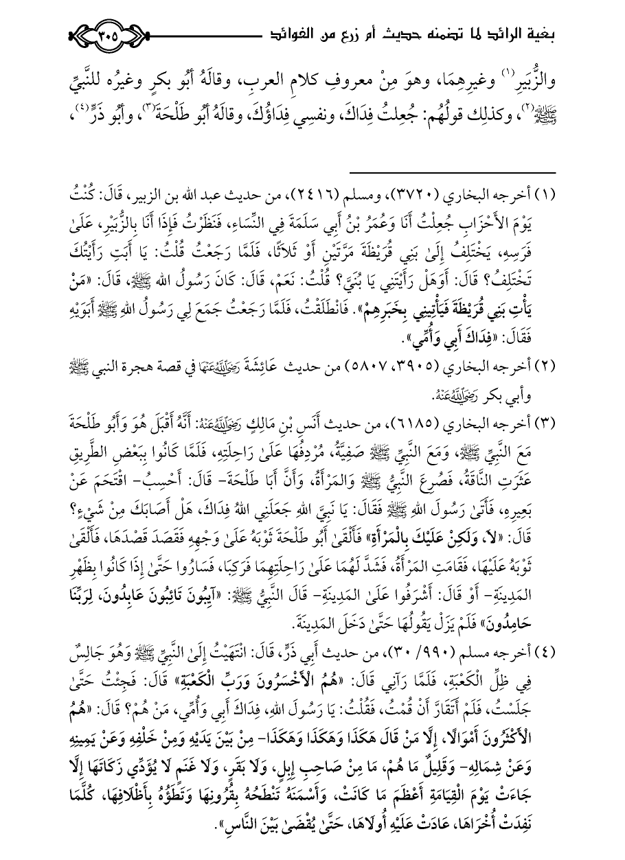 (¬١) أخرجه البخاري (٣٧٢٠)، ومسلم (٢٤١٦)، من حديث عبد الله بن الزبير، قَالَ: كُنْتُ يَوْمَ الأَحْزَابِ جُعِلْتُ أَنَا وَعُمَرُ بْنُ أَبِي سَلَمَةَ فِي النِّسَاءِ، فَنَظَرْتُ فَإِذَا أَنَا بِالزُّبَيْرِ، عَلَى فَرَسِهِ، يَخْتَلِفُ إِلَى بَنِي قُرَيْظَةَ مَرَّتَيْنِ أَوْ ثَلاثًا، فَلَمَّا رَجَعْتُ قُلْتُ: يَا أَبَتِ رَأَيْتُكَ تَخْتَلِفُ؟ قَالَ: أَوَهَلْ رَأَيْتَنِي يَا بُنَيَّ؟ قُلْتُ: نَعَمْ، قَالَ: كَانَ رَسُولُ الله - صلى الله عليه وسلم -، قَالَ: «مَنْ يَأْتِ بَنِي قُرَيْظَةَ فَيَأْتِينِي بِخَبَرِهِمْ». فَانْطَلَقْتُ، فَلَمَّا رَجَعْتُ جَمَعَ لِي رَسُولُ اللَّهِ - صلى الله عليه وسلم - أَبَوَيْهِ فَقَالَ: «فِدَاكَ أَبِي وَأُمِّي».