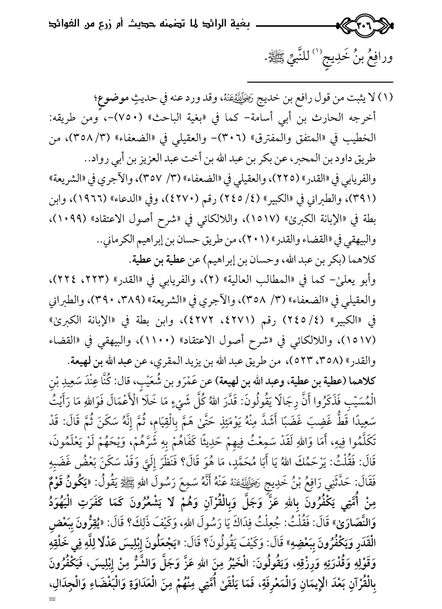 كلاهما (عطية بن عطية، وعبد الله بن لهيعة) عن عَمْرَو بن شُعَيْبٍ، قال: كُنَّا عِنْدَ سَعِيدِ بْنِ الْمُسَيّبِ فَذَكَرُوا أَنَّ رِجَالًا يَقُولُونَ: قَدَّرَ اللَّهُ كُلَّ شَيْءٍ مَا خَلَا الْأَعْمَالَ فَوَاللَّهِ مَا رَأَيْتُ سَعِيدًا قَطُّ غَضِبَ غَضَبًا أَشَدَّ مِنْهُ يَوْمَئِذٍ حَتَّى هَمَّ بِالْقِيَامِ، ثُمَّ إِنَّهُ سَكَنَ ثُمَّ قَالَ: قَدْ تَكَلَّمُوا فِيهِ، أَمَا وَاللَّهِ لَقَدْ سَمِعْتُ فِيهِمْ حَدِيثًا كَفَاهُمْ بِهِ شَرَّهُمْ، وَيْحَهُمْ لَوْ يَعْلَمُونَ، قَالَ: فَقُلْتُ: يَرْحَمُكَ اللَّهُ يَا أَبَا مُحَمَّدٍ، مَا هُوَ قَالَ؟ فَنَظَرَ إِلَيَّ وَقَدْ سَكَنَ بَعْضُ غَضَبِهِ فَقَالَ: حَدَّثَنِي رَافِعُ بْنُ خَدِيجٍ - رضي الله عنه - عَنْهُ أَنَّهُ سَمِعَ رَسُولَ اللَّهِ - صلى الله عليه وسلم - يَقُولُ: «يَكُونُ قَوْمٌ مِنْ أُمَّتِي يَكْفُرُونَ بِاللَّهِ عَزَّ وَجَلَّ وَبِالْقُرْآنِ وَهُمْ لَا يَشْعُرُونَ كَمَا كَفَرَتِ الْيَهُوَدُ وَالنَّصَارَى» قَالَ: فَقُلْتُ: جُعِلْتُ فِدَاكَ يَا رَسُولَ اللَّهِ، وَكَيْفَ ذَلِكَ؟ قَالَ: «يُقِرُّونَ بِبَعْضِ الْقَدَرِ وَيَكْفُرُونَ بِبَعْضِهِ» قَالَ: وَكَيْفَ يَقُولُونَ؟ قَالَ: «يَجْعَلُونَ إِبْلِيسَ عَدْلًا لِلَّهِ فِي خَلْقِهِ وَقَوْلِهِ وَقُدْرَتِهِ وَرِزْقِهِ، وَيَقُولُونَ: الْخَيْرُ مِنَ اللَّهِ عَزَّ وَجَلَّ وَالشَّرُّ مِنْ إِبْلِيسَ، فَيَكْفُرُونَ بِالْقُرْآنِ بَعْدَ الْإِيمَانِ وَالْمَعْرِفَةِ، فَمَا يَلْقَى أُمَّتِي مِنْهُمْ مِنَ الْعَدَاوَةِ وَالْبَغْضَاءِ وَالْجِدَالِ،