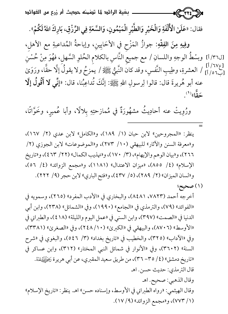 وفِيهِ مِنَ الفِقْهِ: جوازُ المَزْحِ في الأحَايِينِ، وإباحةُ المُداعبةِ مع الأهلِ، وبسْطُ الوجهِ واللسانِ / مع جميعِ النَّاسِ بالكلامِ الحُلوِ السَّهلِ، فهُوَ مِنْ حُسْنِ / العشرةِ، وطِيبِ النَّفسِ، وقد كان النَّبيُّ - صلى الله عليه وسلم - / يمزحُ ولا يقولُ إلَّا حقًّا، ورَوَى عنه أبو هُريرةَ قال: قالوا لِرسولِ اللهِ - صلى الله عليه وسلم -: إنَّكَ تُداعِبُنا، قال: «إنِّي لَا أَقُولُ إلَّا حَقًّا» (¬١).
