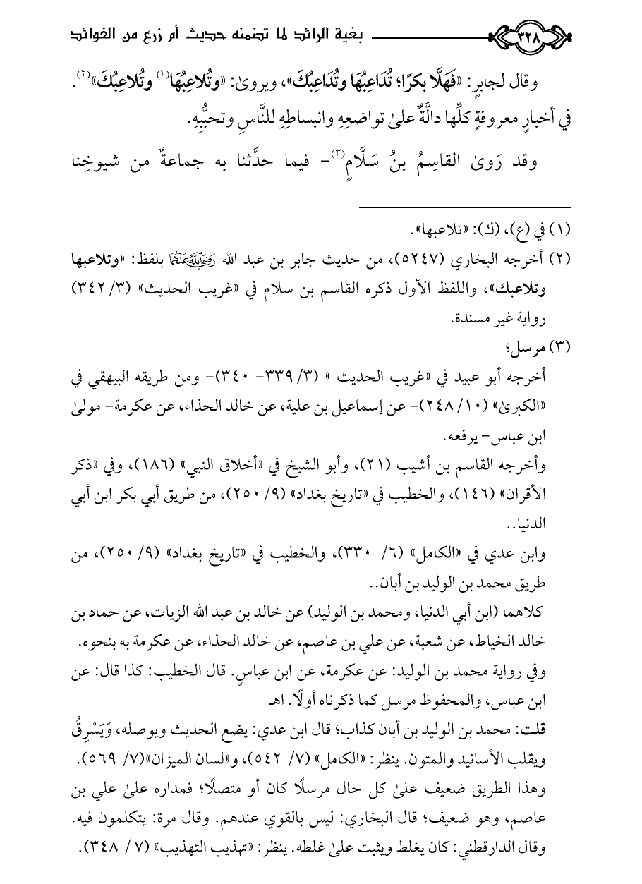 (¬٢) أخرجه البخاري (٥٢٤٧)، من حديث جابر بن عبد الله - رضي الله عنهما - بلفظ: «وتلاعبها وتلاعبك»، واللفظ الأول ذكره القاسم بن سلام في «غريب الحديث» (٣/ ٣٤٢) رواية غير مسندة.