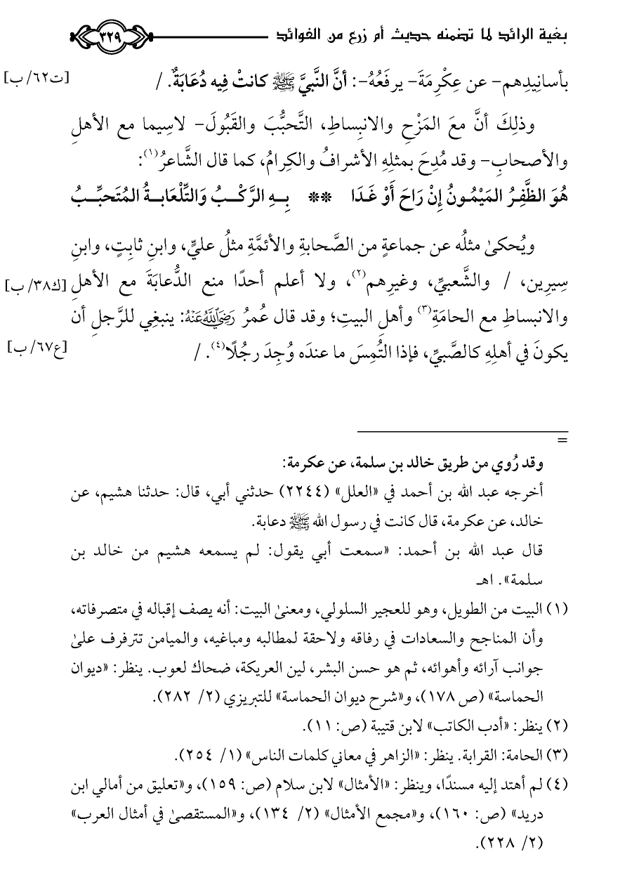 ويُحكى مثلُه عن جماعةٍ من الصَّحابةِ والأئمَّةِ مثلُ عليٍّ، وابنِ ثابِتٍ، وابنِ سِيرِين، / والشَّعبيِّ، وغيرِهم (¬٢)، ولا أعلم أحدًا منع الدُّعابَةَ مع الأهلِ والانبساطِ مع الحامَةِ (¬٣) وأهلِ البيتِ؛ وقد قال عُمرُ - رضي الله عنه -: ينبغِي للرَّجلِ أن يكونَ في أهلِهِ كالصَّبيِّ، فإذا التُمِسَ ما عندَه وُجِدَ رجُلًا (¬٤). /