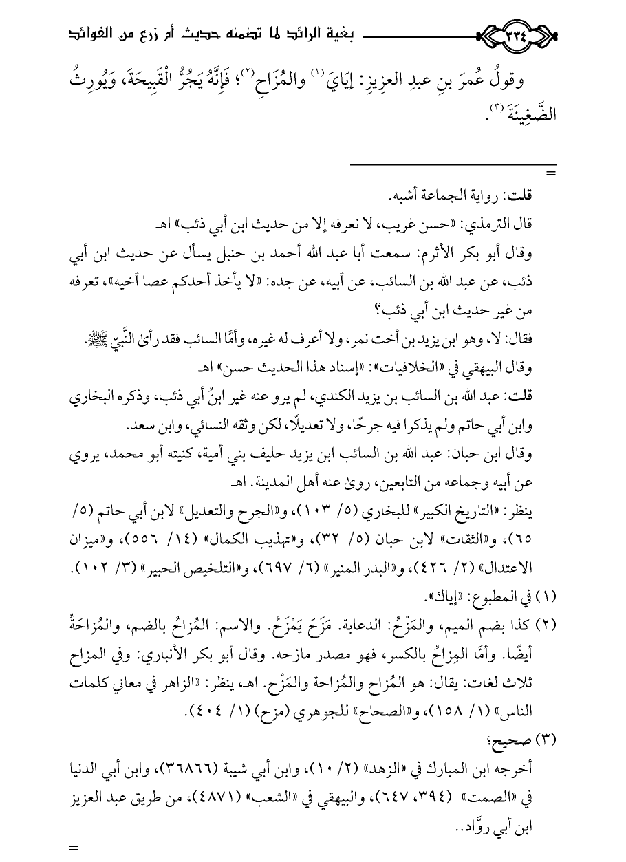 وقولُ عُمرَ بنِ عبدِ العزِيزِ: إيّايَ (¬١) والمُزَاحِ (¬٢)؛ فَإِنَّهُ يَجُرُّ الْقَبِيحَةَ، وَيُورِثُ الضَّغِينَةَ (¬٣).