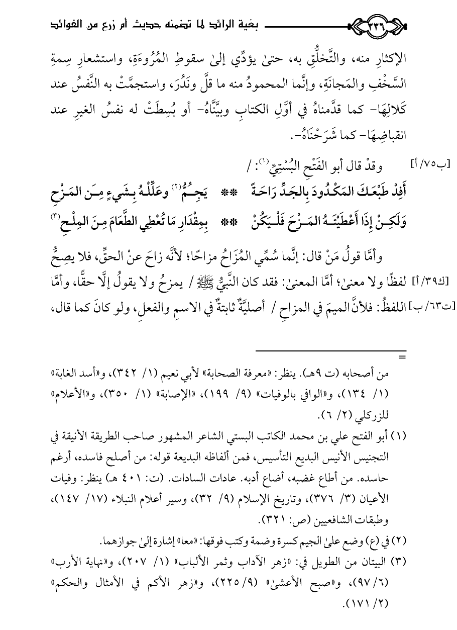 (¬١) أبو الفتح علي بن محمد الكاتب البستي الشاعر المشهور صاحب الطريقة الأنيقة في التجنيس الأنيس البديع التأسيس، فمن ألفاظه البديعة قوله: من أصلح فاسده، أرغم حاسده. من أطاع غضبه، أضاع أدبه. عادات السادات. (ت: ٤٠١ هـ) ينظر: وفيات الأعيان (٣/ ٣٧٦)، وتاريخ الإسلام (٩/ ٣٢)، وسير أعلام النبلاء (١٧/ ١٤٧)، وطبقات الشافعيين (ص: ٣٢١).