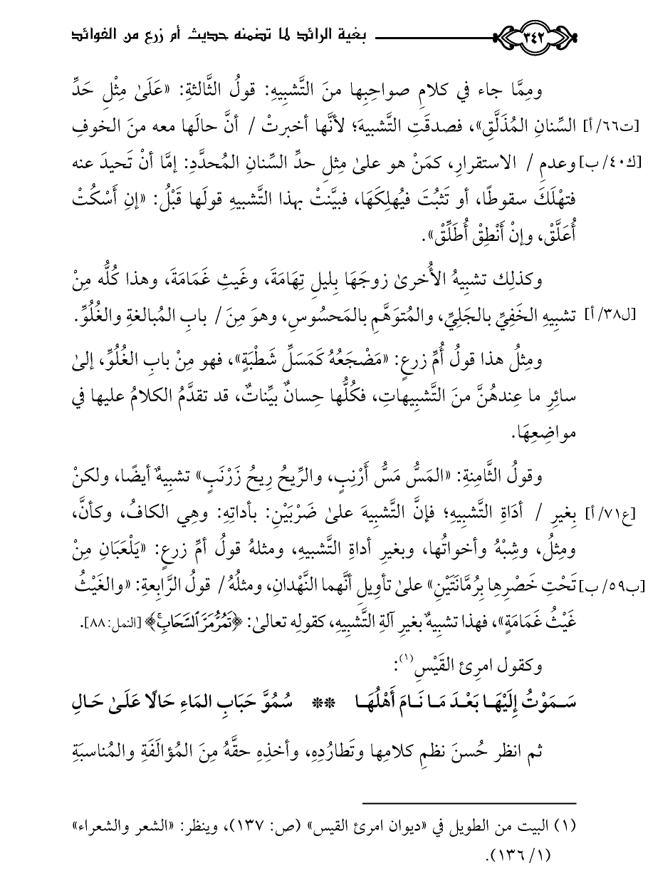وكذلِك تشبِيهُ الأُخرى زوجَهَا بِليلِ تِهَامَةَ، وغَيثِ غَمَامَةَ، وهذا كُلُّه مِنْ تشبِيهِ الخَفِيِّ بالجَلِيِّ، والمُتوَهَّمِ بالمَحسُوسِ، وهوَ مِنَ / بابِ المُبالغةِ والغُلُوِّ.