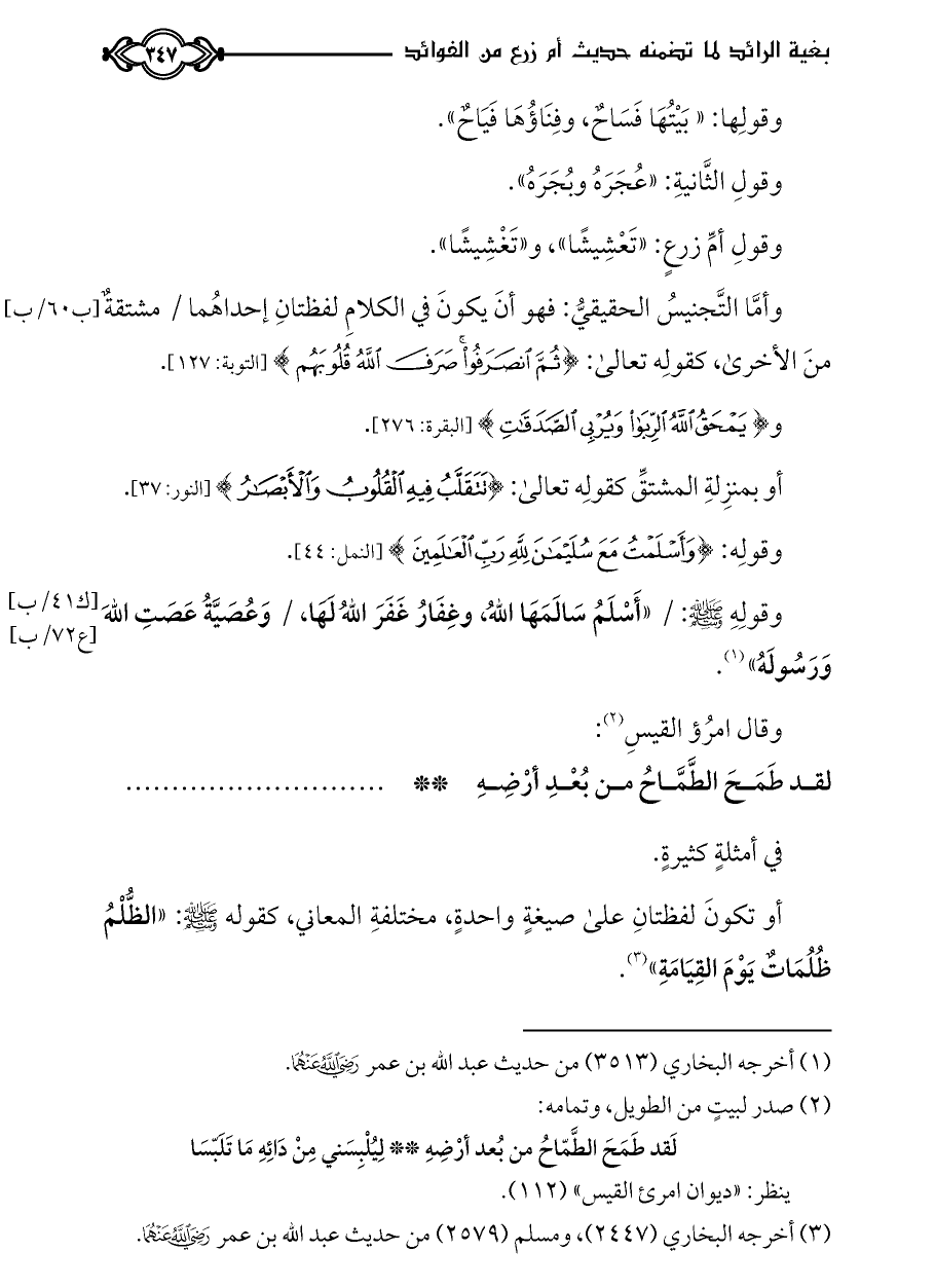 أو تكونَ لفظتانِ على صيغةٍ واحدةٍ، مختلفةِ المعاني، كقوله - صلى الله عليه وسلم -: «الظُّلْمُ ظُلُمَاتٌ يَوْمَ القِيَامَةِ» (¬٣).