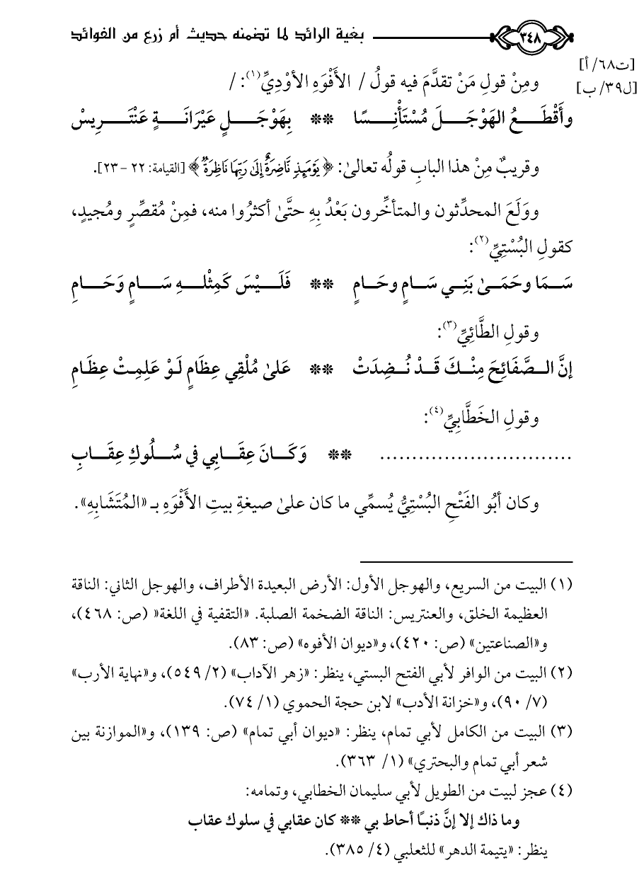 (¬٣) البيت من الكامل لأبي تمام، ينظر: «ديوان أبي تمام» (ص: ١٣٩)، و «الموازنة بين شعر أبي تمام والبحتري» (١/ ٣٦٣).