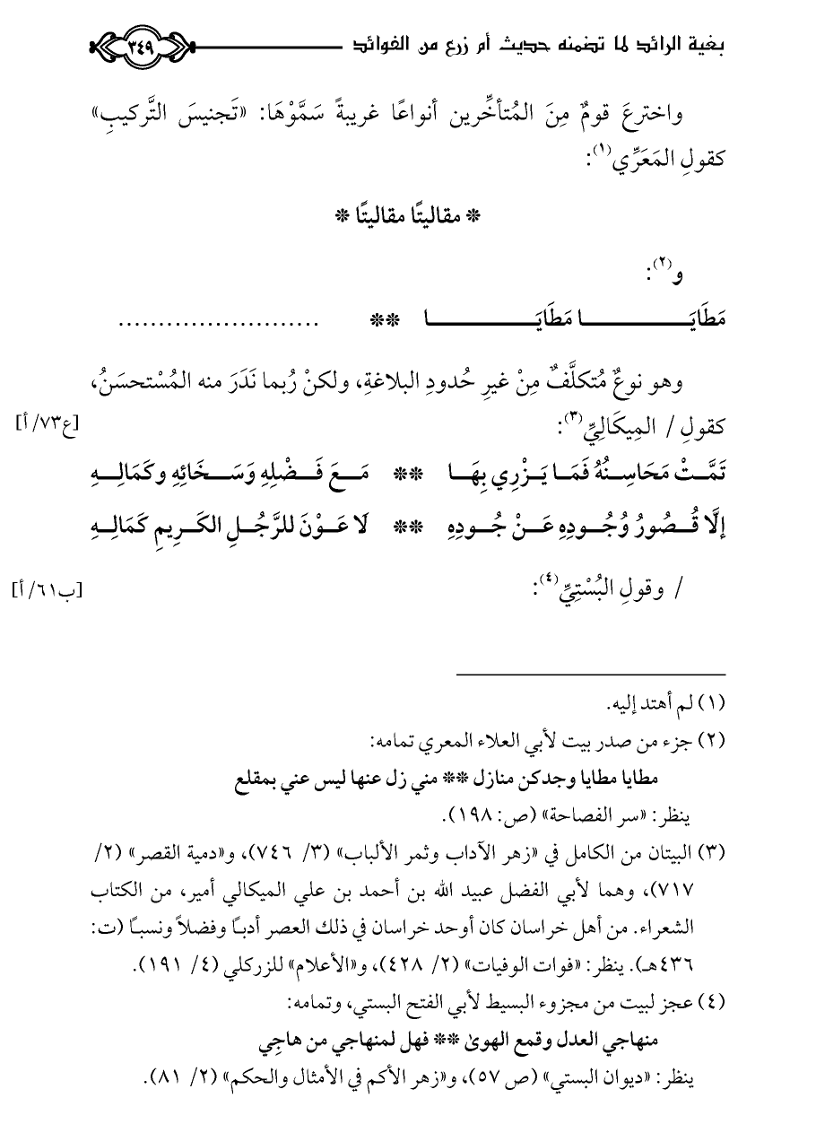 واخترعَ قومٌ مِنَ المُتأخِّرين أنواعًا غريبةً سَمَّوْهَا: «تَجنيسَ التَّركيبِ» كقولِ المَعَرِّي (¬١):