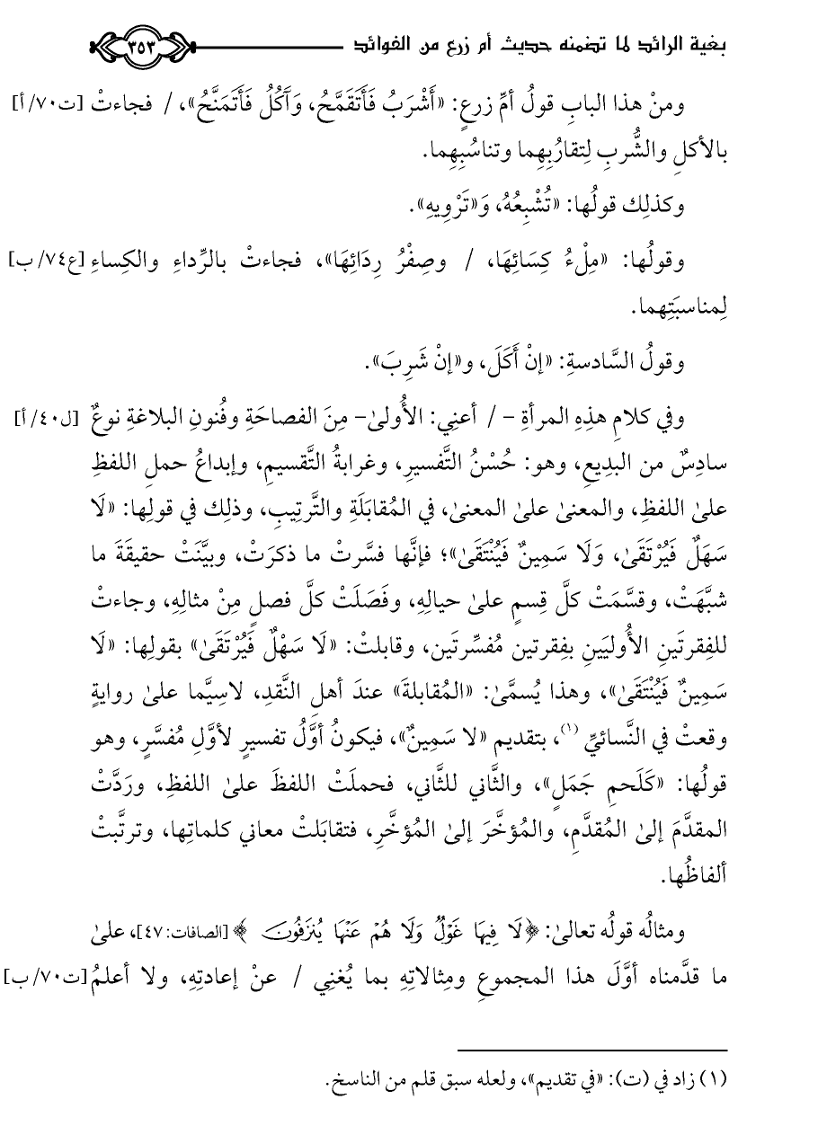ومنْ هذا البابِ قولُ أمِّ زرعٍ: «أَشْرَبُ فَأَتَقَمَّحُ، وَآَكُلُ فَأَتَمَنَّحُ»، / فجاءتْ بالأكلِ والشُّربِ لِتقارُبِهِما وتناسُبِهِما.