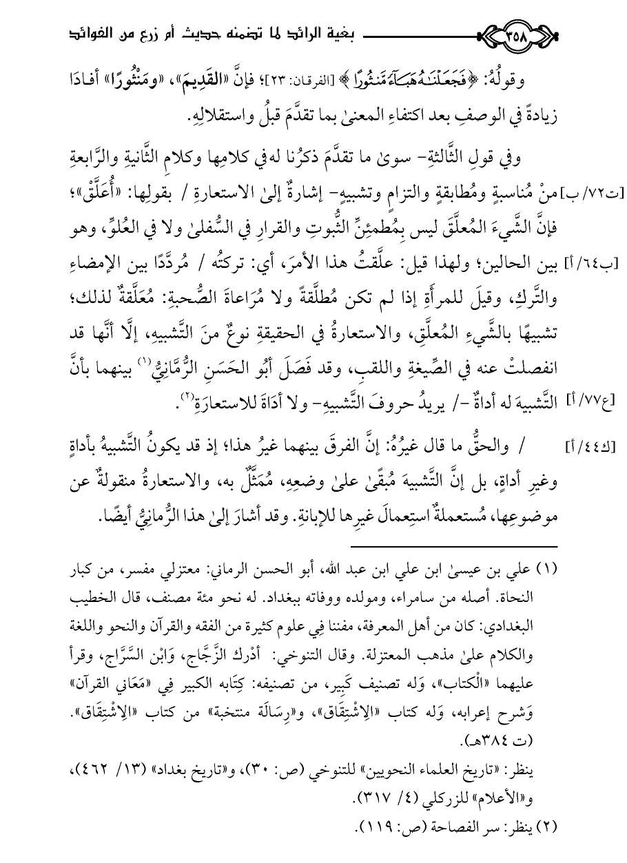 (¬١) علي بن عيسى ابن علي ابن عبد الله، أبو الحسن الرماني: معتزلي مفسر، من كبار النحاة. أصله من سامراء، ومولده ووفاته ببغداد. له نحو مئة مصنف، قال الخطيب البغدادي: كان من أهل المعرفة، مفننا فِي علوم كثيرة من الفقه والقرآن والنحو واللغة والكلام على مذهب المعتزلة. وقال التنوخي: أدْرك الزَّجَّاج، وَابْن السَّرَّاج، وقرأ عليهما «الْكتاب»، وَله تصنيف كَبِير، من تصنيفه: كِتَابه الكبير فِي «مَعَاني القرآن» وَشرح إعرابه، وَله كتاب «الِاشْتِقَاق»، و «رِسَالَة منتخبة» من كتاب «الِاشْتِقَاق».