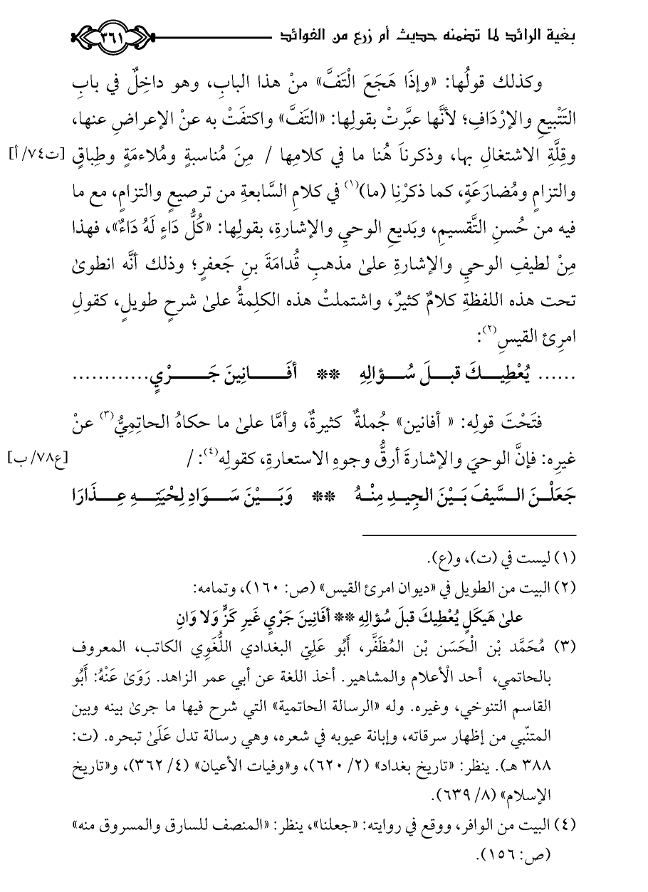 وكذلك قولُها: «وإذَا هَجَعَ الْتَفَّ» منْ هذا البابِ، وهو داخِلٌ في بابِ التَتْبيعِ والإرْدَافِ؛ لأنَّها عبَّرتْ بقولِها: «التَفَّ» واكتفَتْ به عنْ الإعراضِ عنها، وقِلَّةِ الاشتغالِ بها، وذكرنا هُنا ما في كلامِها / مِنَ مُناسبةٍ ومُلاءمَةٍ وطِباقٍ والتزامٍ ومُضارَعَةٍ، كما ذكرْنِا (ما) (¬١) في كلامِ السَّابعةِ من ترصيعٍ والتزامٍ، مع ما فيه من حُسنِ التَّقسيمِ، وبَديعِ الوحيِ والإشارةِ، بقولِها: «كُلُّ دَاءٍ لَهُ دَاءٌ»، فهذا مِنْ لطيفِ الوحيِ والإشارةِ على مذهبِ قُدامَةَ بنِ جَعفرٍ؛ وذلك أنَّه انطوى تحت هذه اللفظةِ كلامٌ كثيرٌ، واشتملتْ هذه الكلِمةُ على شرحٍ طويلٍ، كقولِ امرِئ القيسِ (¬٢):
