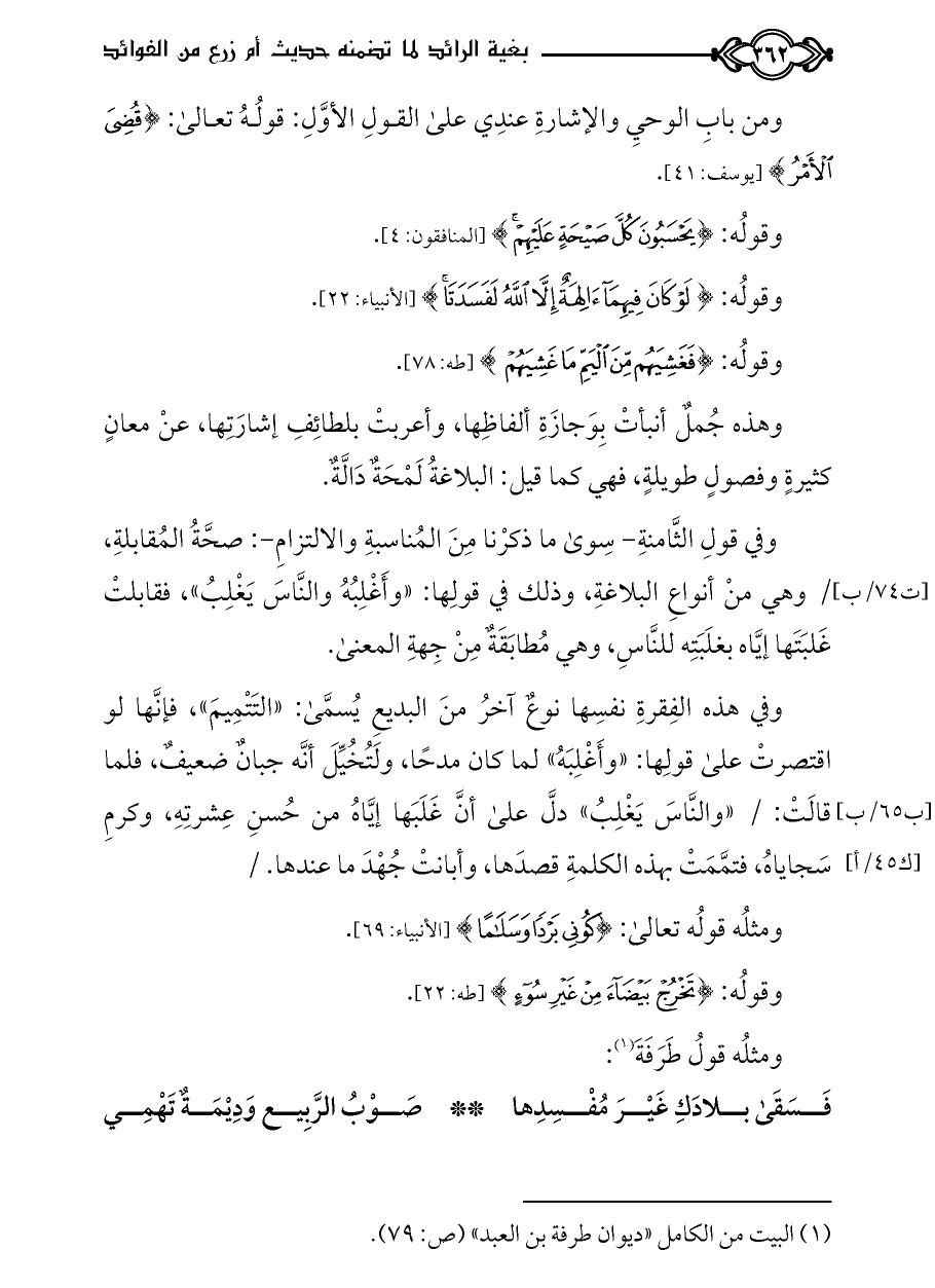 وهذه جُملٌ أنبأتْ بِوَجازَةِ ألفاظِها، وأعربتْ بلطائِفِ إشارَتِها، عنْ معانٍ كثيرةٍ وفصولٍ طويلةٍ، فهي كما قيل: البلاغةُ لَمْحَةٌ دَالَّةٌ.