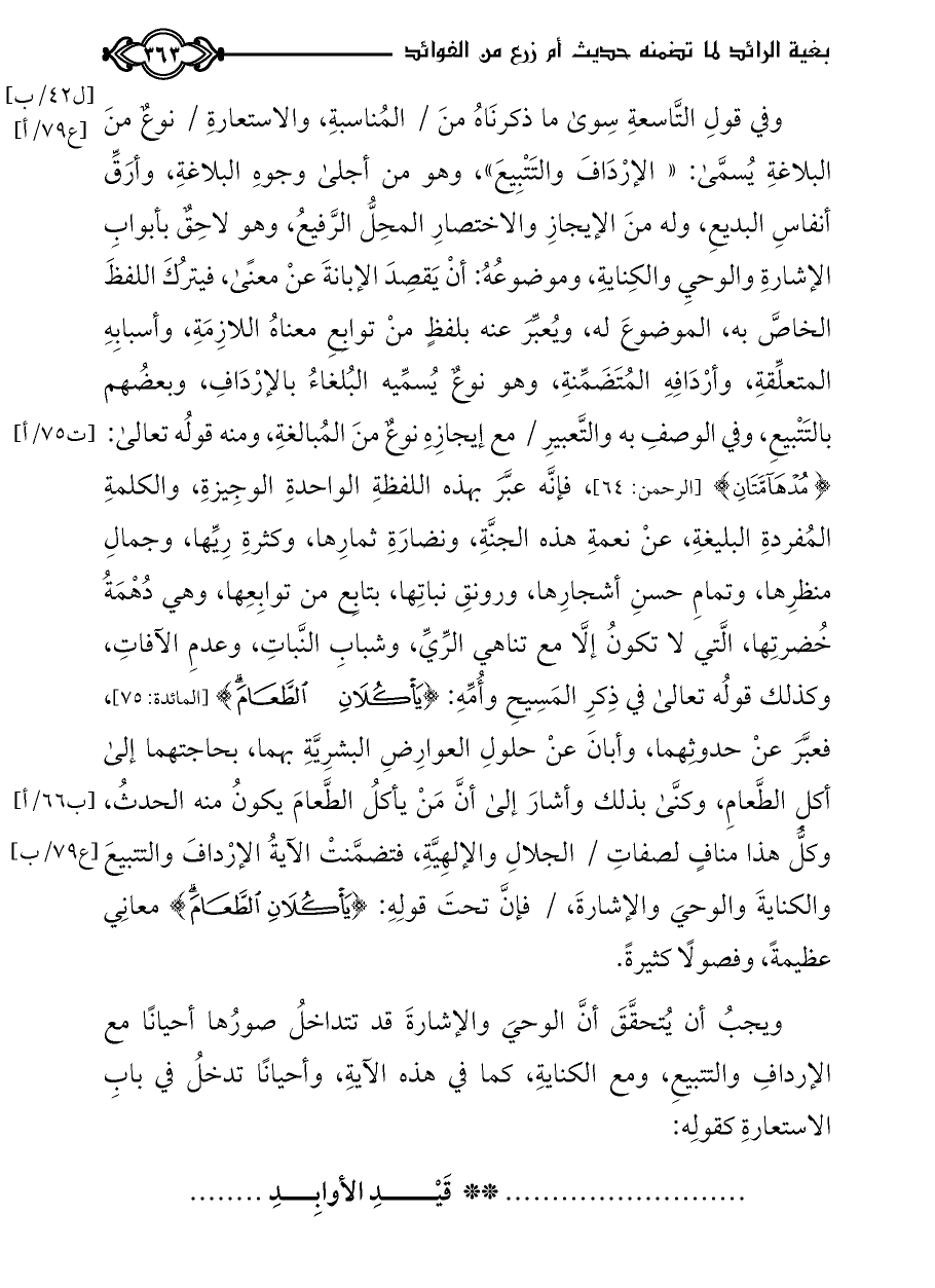 وفي قولِ التَّاسعةِ سِوى ما ذكرنَاهُ منَ / المُناسبةِ، والاستعارةِ / نوعٌ منَ البلاغةِ يُسمَّى: «الإرْدَافَ والتَتْبِيعَ»، وهو من أجلى وجوهِ البلاغةِ، وأرَقِّ أنفاسِ البديعِ، وله منَ الإيجازِ والاختصارِ المحِلُّ الرَّفيعُ، وهو لاحِقٌ بأبوابِ الإشارةِ والوحيِ والكِنايةِ، وموضوعُهُ: أنْ يَقصِدَ الإبانةَ عنْ معنًى، فيترُكَ اللفظَ الخاصَّ به، الموضوعَ له، ويُعبِّرَ عنه بلفظٍ منْ توابِعِ معناهُ اللازِمَةِ، وأسبابِهِ المتعلِّقةِ، وأرْدَافِهِ المُتَضَمِّنةِ، وهو نوعٌ يُسمِّيه البُلغاءُ بالإرْدَافِ، وبعضُهم بالتَتْبيعِ، وفي الوصفِ به والتَّعبيرِ / مع إيجازِهِ نوعٌ منَ المُبالغةِ، ومنه قولُه تعالى: