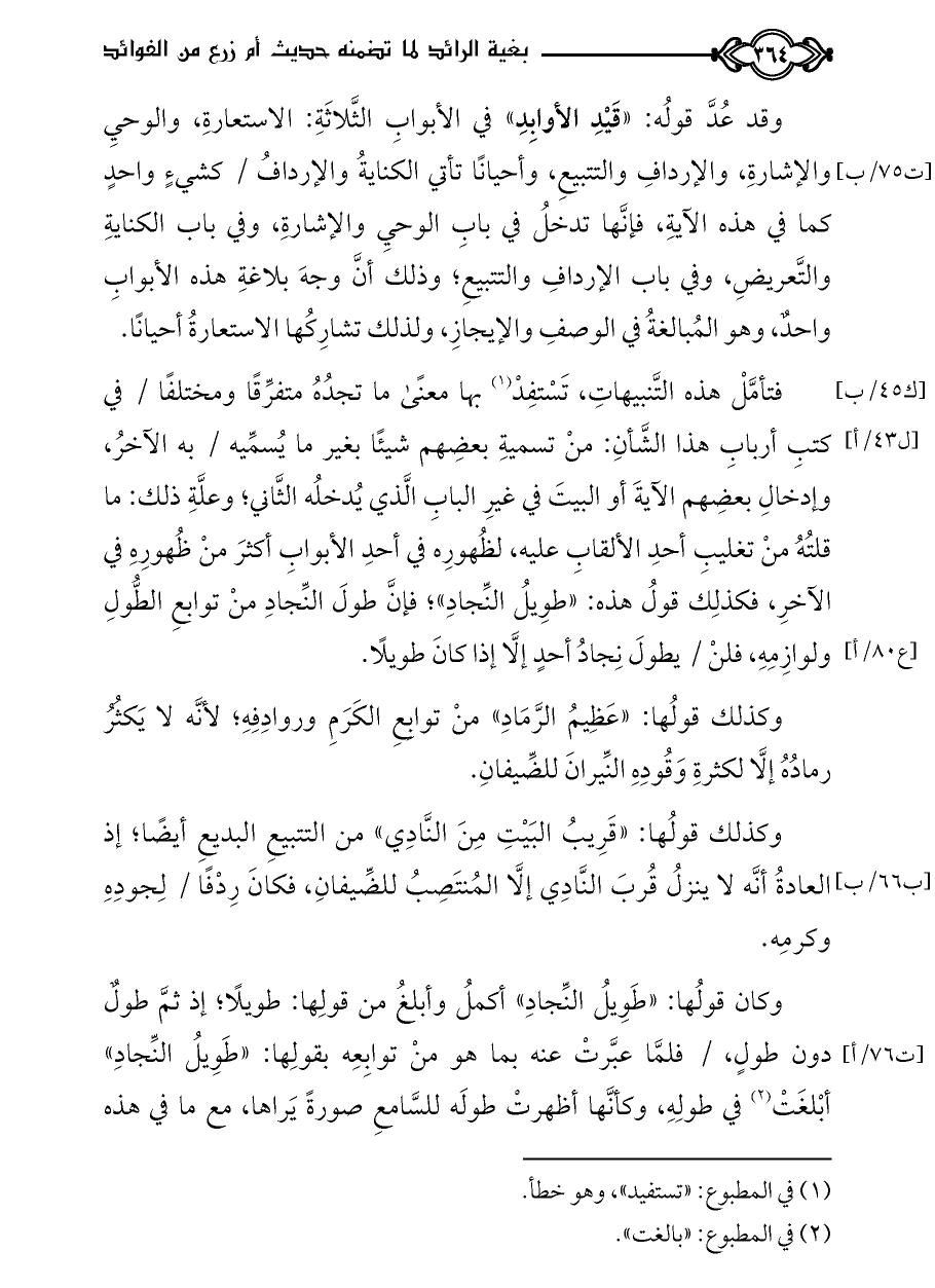 فتأمَّلْ هذه التَّنبيهاتِ، تَسْتفِدْ (¬١) بها معنًى ما تجدُهُ متفرِّقًا ومختلفًا / في كتبِ أربابِ هذا الشَّأنِ: منْ تسميةِ بعضِهم شيئًا بغير ما يُسمِّيه / به الآخرُ، وإدخالِ بعضِهم الآيةَ أو البيتَ في غيرِ البابِ الَّذي يُدخلُه الثَّاني؛ وعلَّةِ ذلك: ما قلتُهُ منْ تغليبِ أحدِ الألقابِ عليه، لظُهورِه في أحدِ الأبوابِ أكثرَ منْ ظُهورِهِ في الآخرِ، فكذلِك قولُ هذه: «طوِيلُ النِّجادِ»؛ فإنَّ طولَ النِّجادِ منْ توابعِ الطُّولِ ولوازِمِهِ، فلنْ / يطولَ نِجادُ أحدٍ إلَّا إذا كانَ طويلًا.