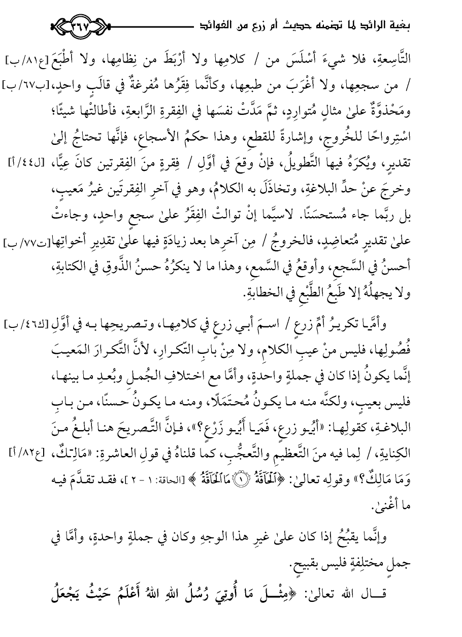 التَّاسِعةِ، فلا شيءَ أسْلَسَ من / كلامِها ولا أرْبَطَ من نِظامِها، ولا أطْبَعَ