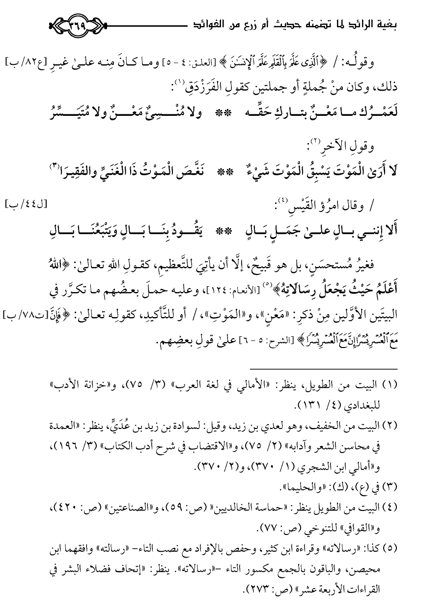 وقولُه: / {الَّذِي عَلَّمَ بِالْقَلَمِ عَلَّمَ الْإِنْسَانَ} [العلق: ٤ - ٥] وما كانَ مِنه على غيرِ ذلك، وكان منْ جُملةٍ أو جملتين كقولِ الفَرَزْدَقِ (¬١):