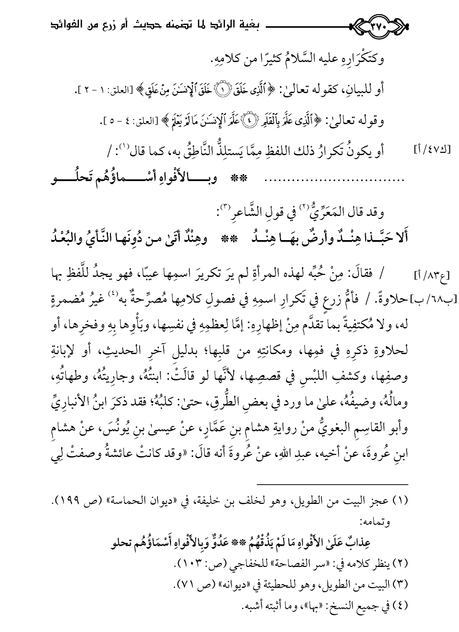 / فقالَ: مِنْ حُبِّه لهذه المرأةِ لم يرَ تكريرَ اسمِها عيبًا، فهو يجدُ للَّفظِ بها حلاوةً.
