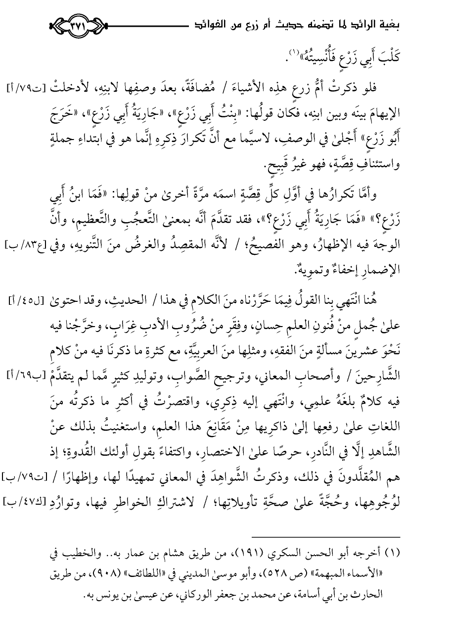 فلو ذكرتْ أمُّ زرعٍ هذِه الأشياءَ / مُضافَةً، بعدَ وصفِها لابنِهِ، لأدخلتْ الإيهامَ بينَه وبين ابنِه، فكان قولُها: «بِنْتُ أَبِي زَرْعٍ»، «جَارِيَةُ أَبِي زَرْعٍ»، «خَرَجَ أَبُو زَرْعٍ» أَجْلى في الوصفِ، لاسيَّما مع أنَّ تَكرارَ ذِكرِهِ إنَّما هو في ابتداءِ جملةٍ واستئنافِ قِصَّةٍ، فهو غيرُ قَبِيحٍ.