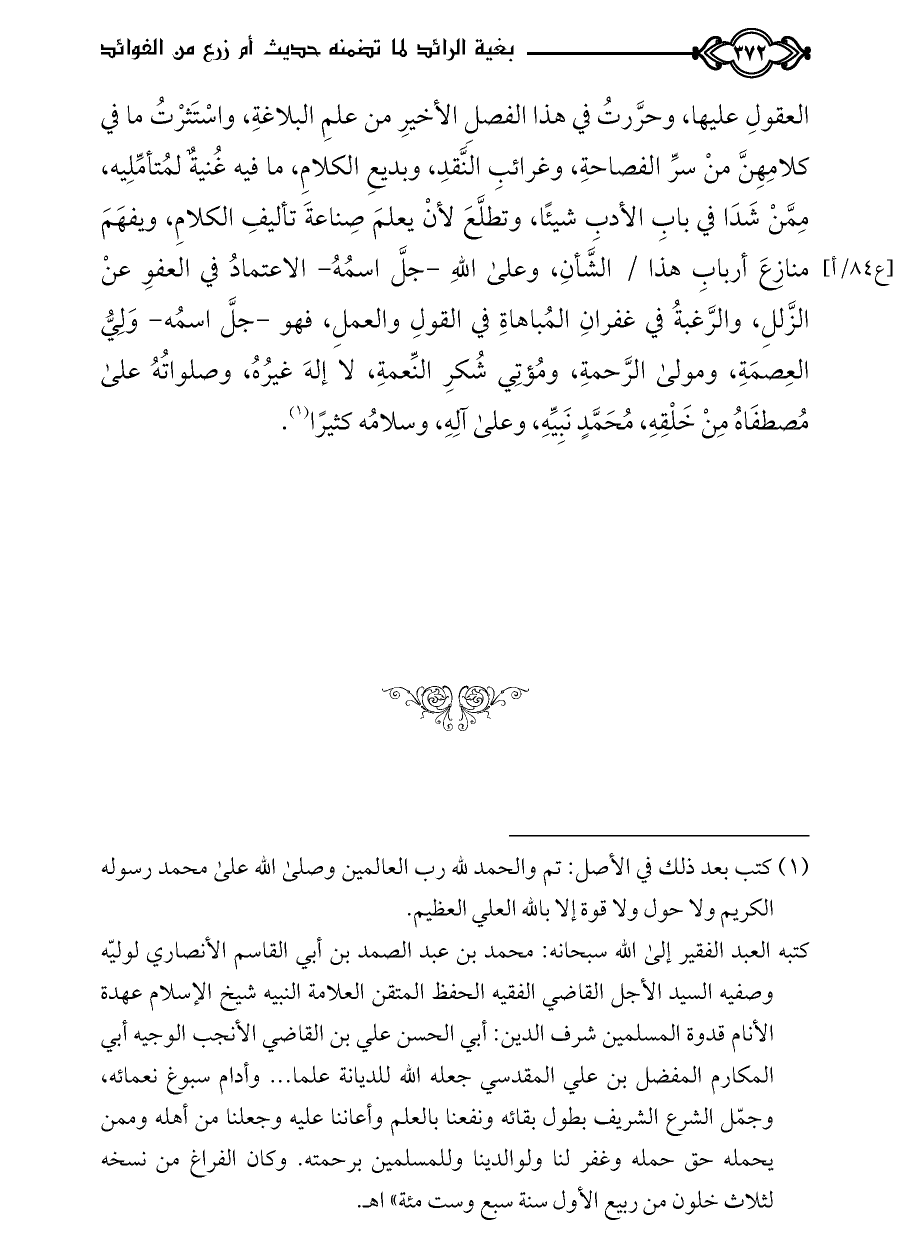 كتبه العبد الفقير إلى الله سبحانه: محمد بن عبد الصمد بن أبي القاسم الأنصاري لوليّه وصفيه السيد الأجل القاضي الفقيه الحفظ المتقن العلامة النبيه شيخ الإسلام عهدة الأنام قدوة المسلمين شرف الدين: أبي الحسن علي بن القاضي الأنجب الوجيه أبي المكارم المفضل بن علي المقدسي جعله الله للديانة علما ... وأدام سبوغ نعمائه، وجمّل الشرع الشريف بطول بقائه ونفعنا بالعلم وأعاننا عليه وجعلنا من أهله وممن يحمله حق حمله وغفر لنا ولوالدينا وللمسلمين برحمته. وكان الفراغ من نسخه لثلاث خلون من ربيع الأول سنة سبع وست مئة» اهـ.