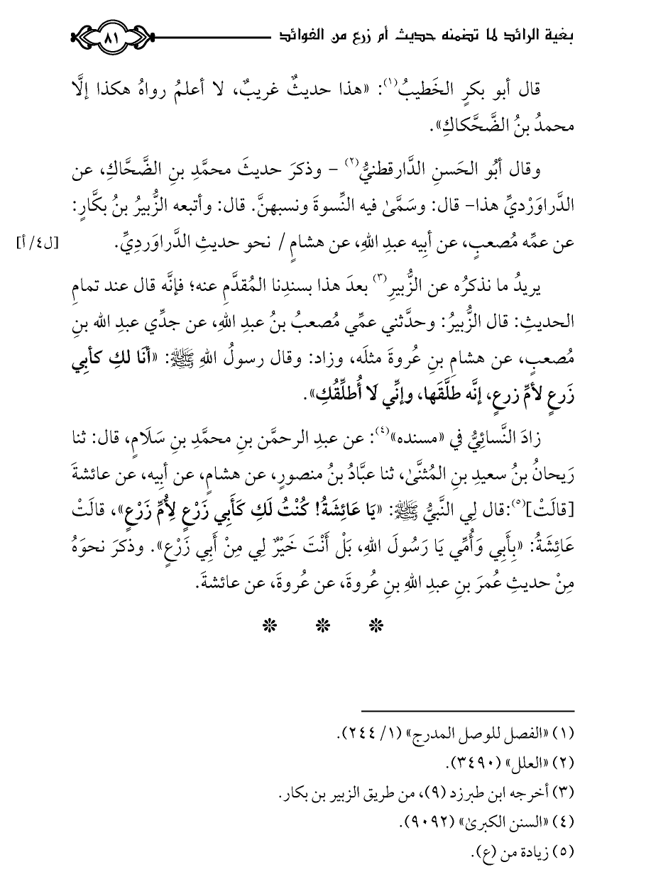 وقال أبُو الحَسنِ الدَّارقطنيُّ (¬٢) - وذكرَ حديثَ محمَّدِ بنِ الضَّحَّاكِ، عن الدَّراوَرْديِّ هذا- قال: وسَمَّى فيه النِّسوةَ ونسبهنَّ. قال: وأتبعه الزُّبيرُ بنُ بكَّارٍ: عن عمِّه مُصعبٍ، عن أبِيه عبدِ اللهِ، عن هشامٍ / نحو حديثِ الدَّراوَردِيِّ.