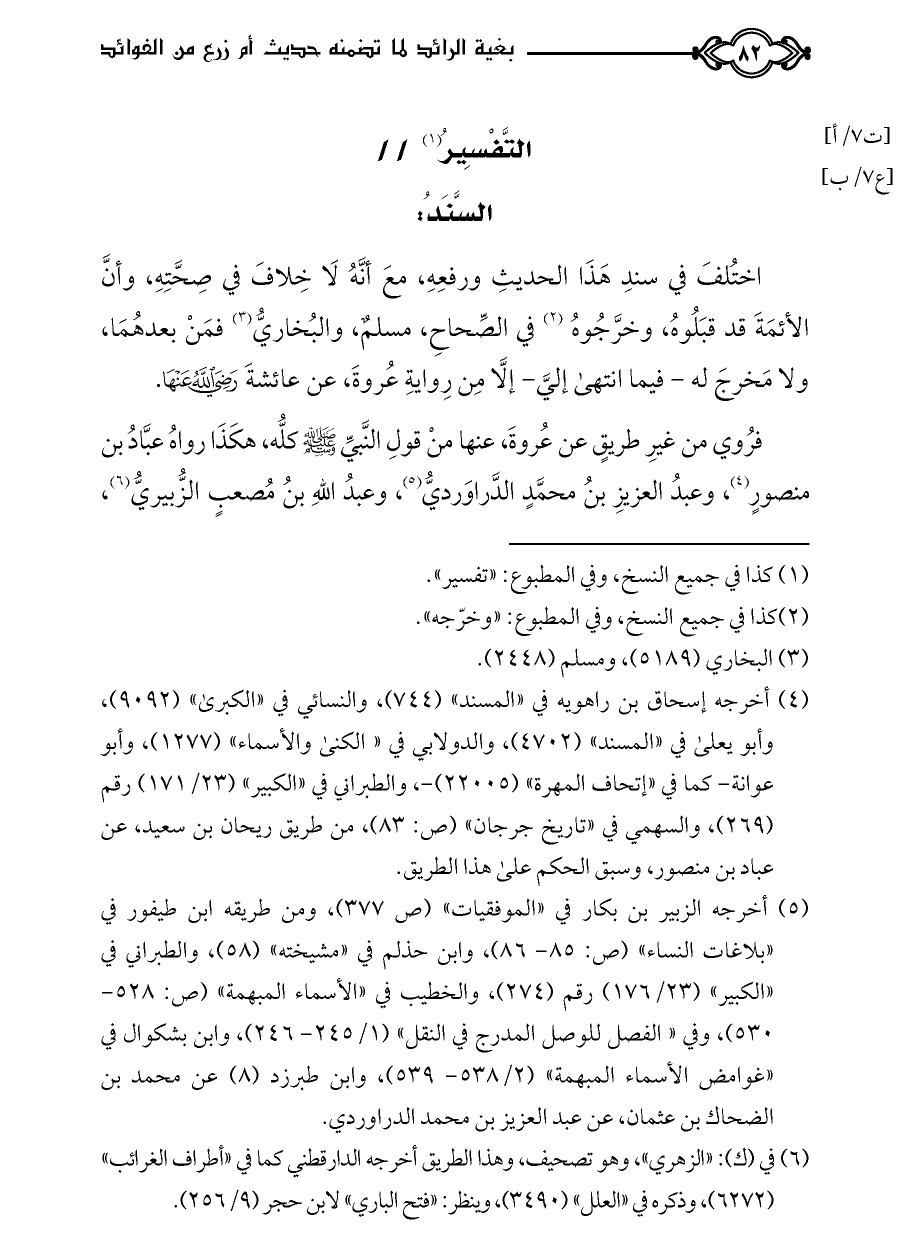فرُوي من غيرِ طريقٍ عن عُروةَ، عنها منْ قولِ النَّبيِّ - صلى الله عليه وسلم - كلُّه، هكَذَا رواهُ عبَّادُ بن منصورٍ (¬٤)، وعبدُ العزيزِ بنُ محمَّدٍ الدَّراوَرديُّ (¬٥)، وعبدُ اللهِ بنُ مُصعبٍ الزُّبيريُّ (¬٦)،