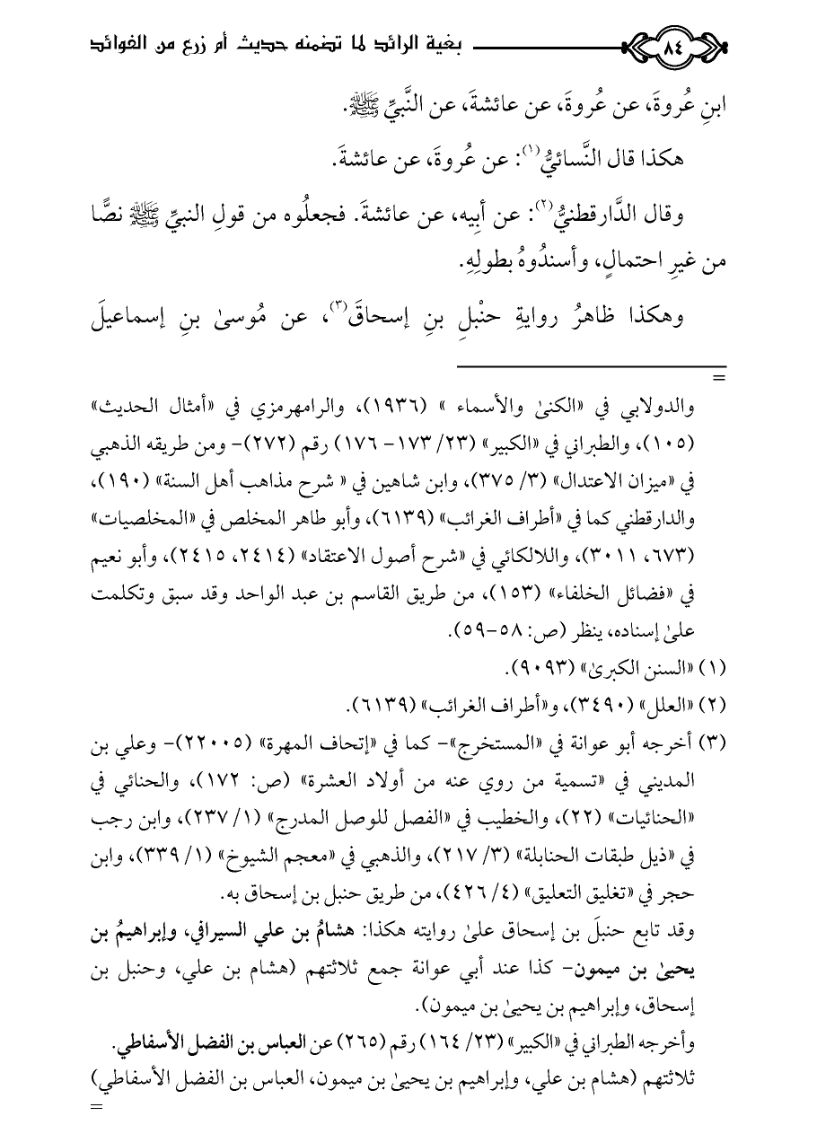 ابنِ عُروةَ، عن عُروةَ، عن عائشةَ، عن النَّبيِّ - صلى الله عليه وسلم -.